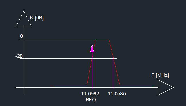 Przy założeniu charakterystyki filtra kwarcowego jak wyżej i częstotliwości BFO na dolnym zboczu filtra (tłumienie nośnej ok. 20dB) można określić następujące częstotliwości generatorów zapewniających odbiór każdego z pasm:
