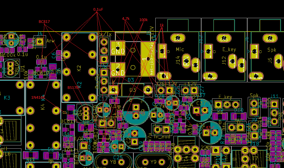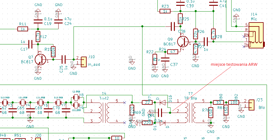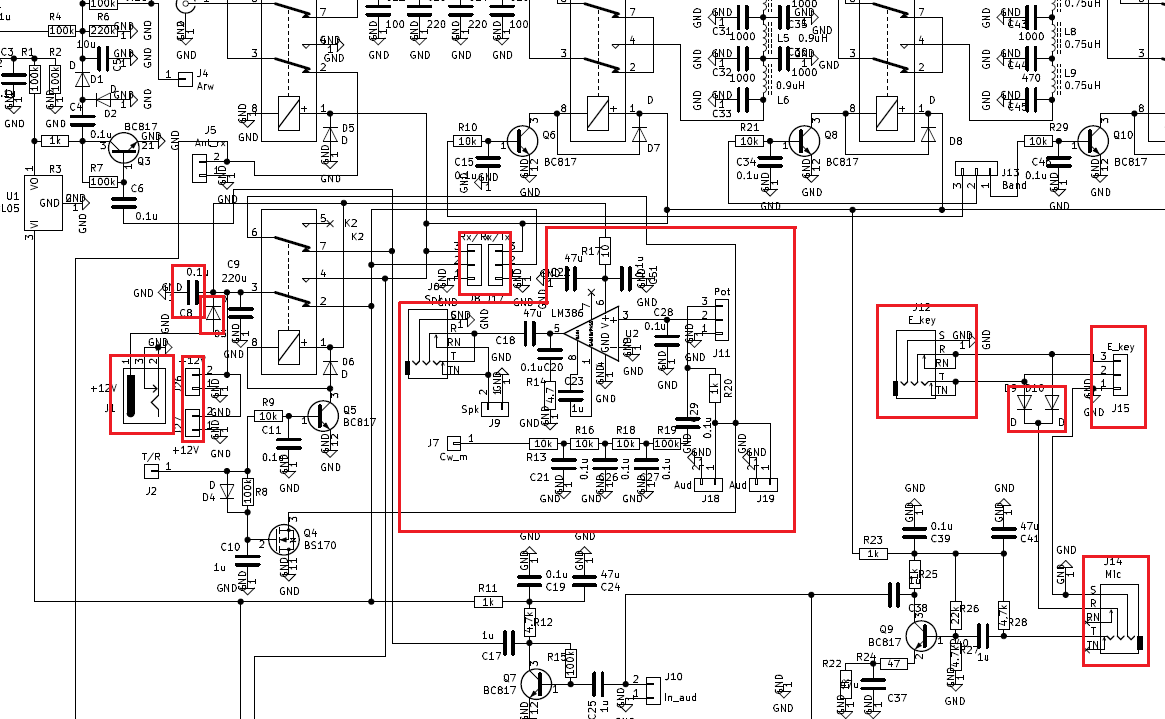 Na początek zacząłem montaż gniazd oraz wzmacniacza m.cz. Montowane elementy zaznaczyłem kolorem czerwonym. Nie ma potrzeby montować złącz J18 i J19. Układ wzmacniacza jest klasyczny, na uwagę może jedynie zasługiwać sekcja zbudowana z elementów: J7, R13, R16, R18, R19, C21, C26, C27, C29. To układ filtra dolnoprzepustowego kształtujący sygnał prostokątny monitora CW - z logiki transceivera, do postaci sygnału sinusa o odpowiednio wytłumionej amplitudzie doprowadzonego na wejście wzmacniacza m.cz. Dioda w obwodzie zasilania - D3, to dioda o prądzie 3A. Ponieważ zasilanie do nadajnika będzie prowadzone z płytki odbiornika to dlatego potrzebna jest tu dioda o podwyższonym prądzie. Diody D9 i D10 oraz inne diody nie działające w mieszaczach to diody typu smd 1N4148.