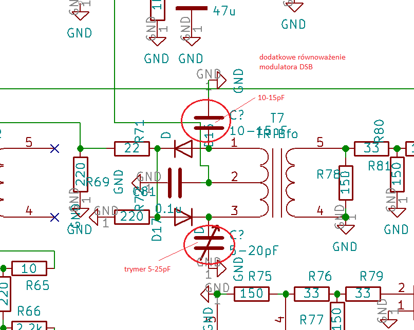 - układ na tyle mi się spodobał, że prawdopodobnie podejmę próbę zrobienia drugiej wersji płytek dla tego urządzenia gdzie postaram się poprawić wszystkie obecne błędy. Wstawię inny wzmacniacz m.cz. modulatora, wprowadzę możliwość równoważenia modulatora, zmienię układ płytki tak aby sygnał BFO był oddalony od wejścia wzmacniacza pierwszej pośredniej nadajnika oraz przeniosę filtry nadajnika wraz z gniazdem antenowym na płytkę nadajnika.