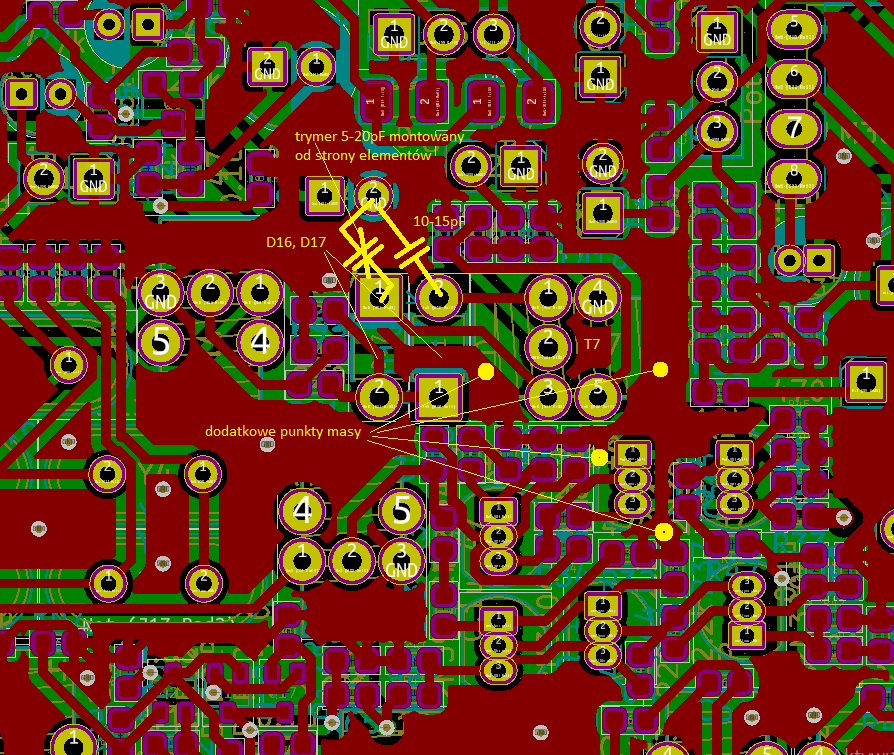 Prawie doskonałym rozwiązaniem tego problemu okazało się wykonanie dodatkowych zwor pomiędzy masami górnej i dolnej części płytki urządzenia. Rysunek pokazuje , w których miejscach należy zrobić to połączenie. Oczywiście wymaga to sporej precyzji i delikatności ze względu na zmontowane już elementy. Na pustej płytce powinno to się udać znacznie łatwiej. Z pokazanym systemem zwor oraz z dodatkowym równoważeniem za pomocą pokazanych kondensatorów (z czego jeden to trymer) udaje się zejść z poziomem nośnej do wartości szumów wzmacniacza a więc całkiem przyzwoicie. Kondensator stały 10pF został wlutowany od spodu a trymer dołączony do wyprowadzenia jednej z diod i masy.