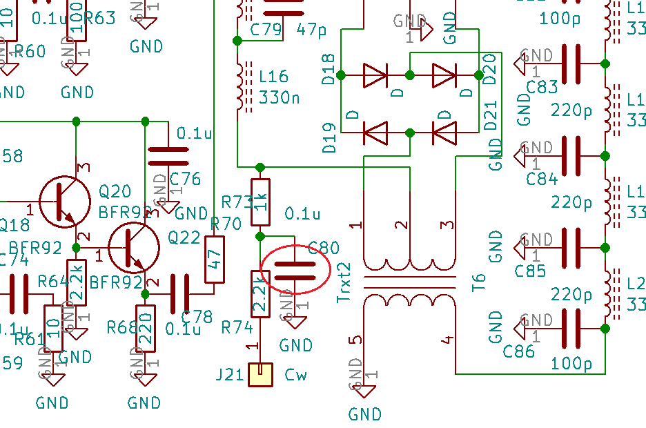 Kluczowanie doprowadzone jest do pin-u J21 ale chciałbym zwrócić uwagę na kondensator C80, który w oryginale ma 0.1uF. Zastąpienie tego kondensatora większym, np. 4.7uF powoduje, że sygnał kluczowany nabiera zaokrągleń.