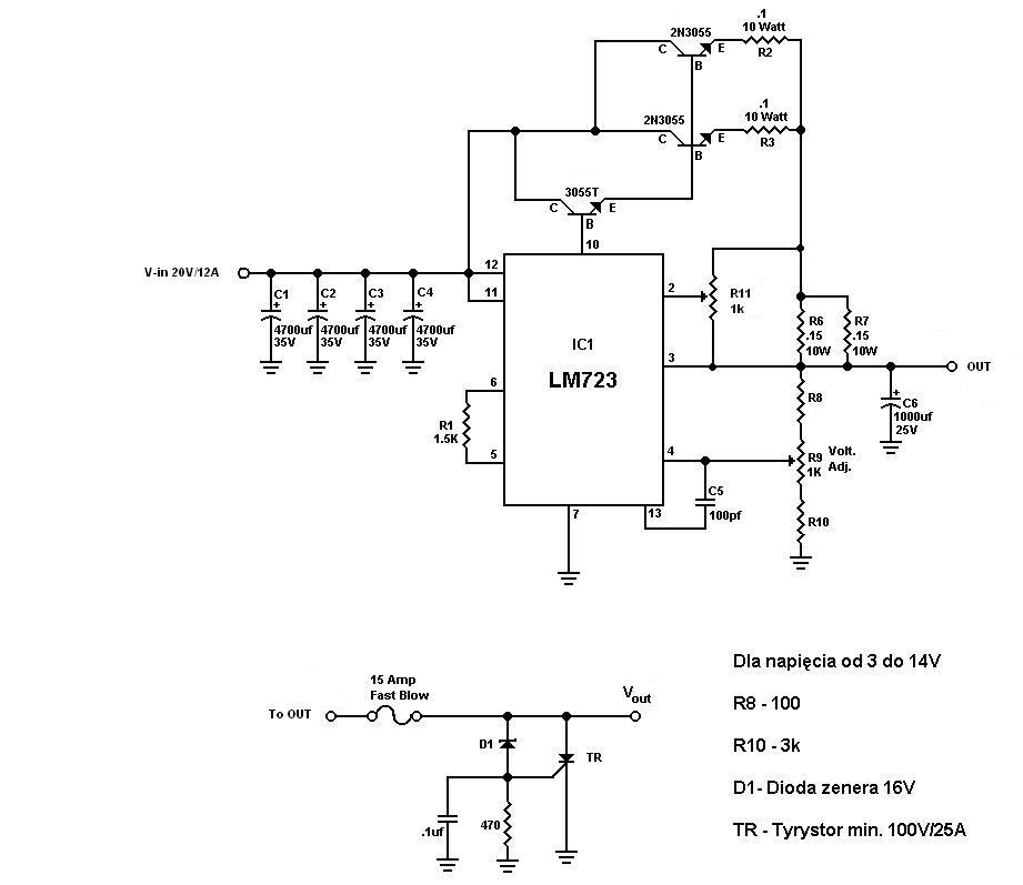 Przy podanych wartościach elementów uzyskałem zakres regulacji od 3V do 14V. Zamiast 2n3055 możesz zastosować każdy inny tranzystor o wytrzymałości min 10A. Choć szczerze to z tymi tranzystorami dalej problemu nie ma w sklepach jak i z lepszymi np. KD502 a obudowa tego tranzystora typu TO-3 zapewnia prawidłowe chłodzenie na radiatorze. Układ ten posiada limiter prądu wyjściowego regulowanym na potencjometrze R11.