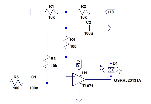 Wygląda całkiem nieźle. Na wykresie logarytmicznym prawie linia prosta. Być może wolałbym większy wzrost sygnału w okolicach 'zera'. Natomiast nie jest to limiter - wraz ze zwiększaniem się sygnału wejściowego, nawet dla dużych wartości, sygnał wyjściowy również rośnie , choć powoli. Przy bardzo silnym gwiździe, jest możliwość przekroczenia sygnału wyjściowego. Zastanawiam się czy diody LED nie powinny być jaśniejsze.