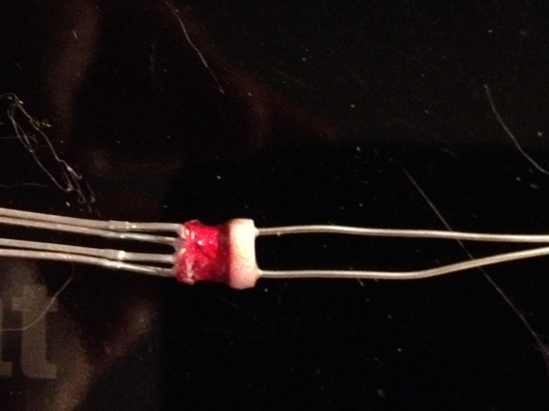 Diody jakich użyłem to dwie L-424IDT (czerwone). Fotorezystor ten sam co w Husarku. Delikatnie, na drobnym papierze ściernym starłem diody wzdłuż, prawie do połowy, tak żeby nie uszkodzić struktury. Skleiłem obie kropelką, po sklejeniu starłem diody " w pionie" do długości ok 2mm (były dość długie).