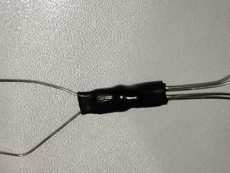 Kropelką przykleiłem sklejone diody czołem do fotorezystora. Nie mam czarnego kleju na gorąco, więc kilkukrotnie uszczelniłem całość koszulkami termokurczliwymi. Pomiar pod lampą pokazał opór rzędu kilkuset kiloomów więc nieźle. Całość zajęła pół godziny (włącznie z rozklejaniem palców).