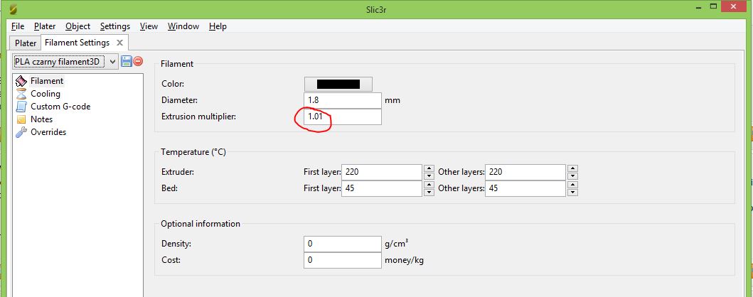 Krzysztofie, wykonaj kalibrację extrudera, i ja i Paweł Ci to powtarzamy od kilku dni, ja akurat używam Slic3r'a od kilku lat, próbowałem innych ale jakoś tak mam że po eksperymentach z innymi slicerami zawsze do niego wracałem, po prostu ma największe możliwości manipulacji wydrukiem, łącznie ze zmianą grubości warstwy w trakcie wydruku.