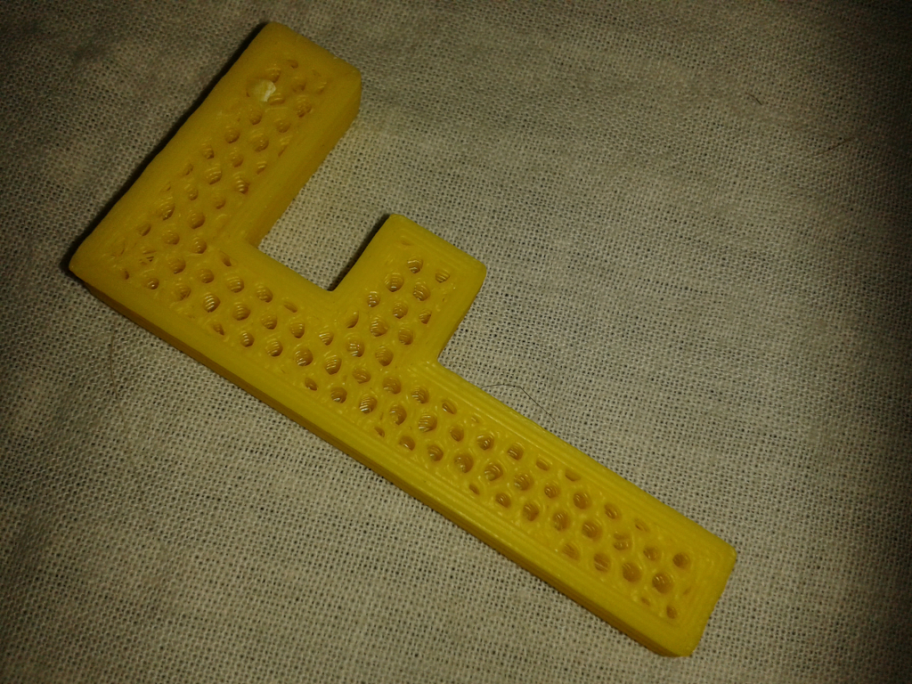 Na pierwszy ogień poszedł wydruk literki F tak by się zorientować w kalibracji drukarki. Wydruk ten przerwałem w połowie. Zobaczcie jak fajnie wygląda wypełnienie przedmiotu. Ustawiłem wypełnienie 60% i wzór plastra miodu.