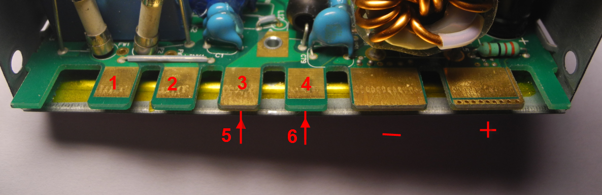 Te "piny" to odpowiednio ukształtowane fragmenty dwustronnej PCB. Korzystając z sugestii Zdzisława ustaliłem te, na które należy podać zasilanie. Podłączyłem 230 i zasilacz zaskoczył po kilku sekundach (soft start?). Na wyjściu 27,2V. Trochę głośne wentylatory.