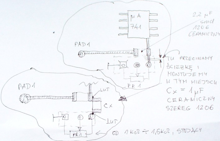 Sprawę uzupełnienia układu o pojemność pomiędzy wyjściem z uA741 , a PR1 (doprowadzającym sygnał do generatora ARW) rozwiązałem poprzez przecięcie ścieżki i wstawienie w tym miejscu kondensatora. Jest to widoczne na załączonym zdjęciu. W takim rozwiązaniu możemy montować PR1 tak jak to jest zaznaczone na płytce. Wcześniej Koledzy wspominali , że wartość PR1 należy zawrzeć pomiędzy 1kohm , a 1,5kohm. Tak zrobię.
