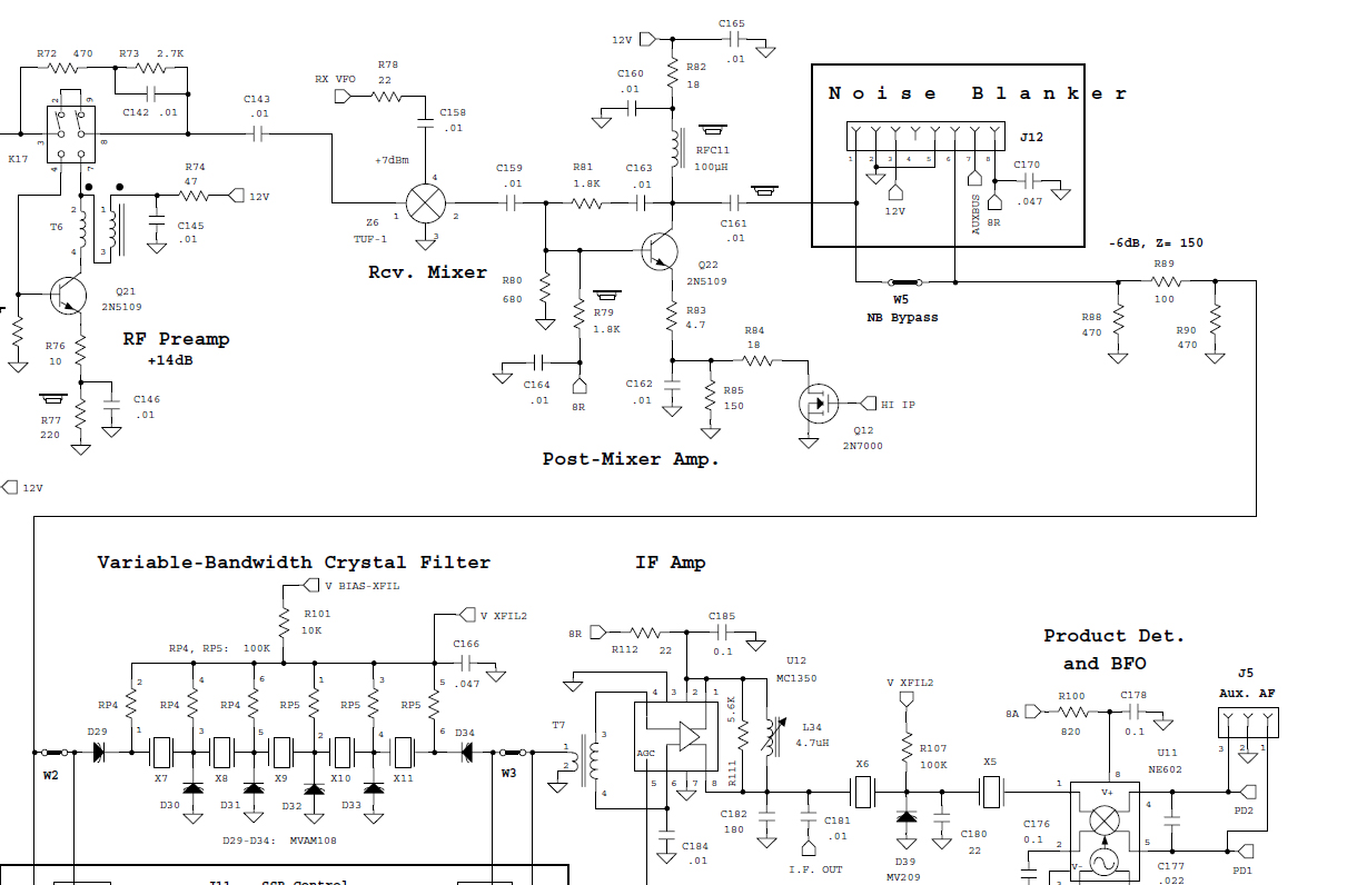 Śmieszna sprawa - wrzuciłem ten układ "Post Mixer Amp" z 2N5109 z K2 do symulatora i wyszło że impedancję taką jak chcemy to on może mieć dopiero od dobrych kilku MHz w górę, wcześniej jest sporo większa. Wszystko przez za mały kondensator w emiterze C162 - w K2 jest 10nF, ale przy tak małym rezystorze powinien być z 10x większy.