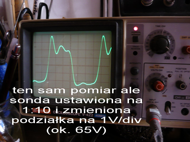 Jedno co dało mi się zauważyć i co mnie zaciekawiło to kiedy zmniejszę moc tak aby przebiegi mieściły się na ekranie oscyloskopu bez włączonego dzielnika w sondzie 1:10, to mają całkiem znośny przebieg(z włączonym na tej niskiej mocy dalej są zniekształcone). Z włączonym dzielnikiem "górki" są dalej pofalowane a bez jest ok. Sondy osc. mam raczej OK.