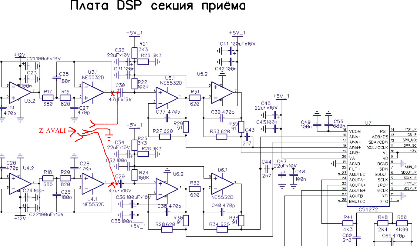 Obrazek na szybko, i trochę nieudolnie zrobiony.... Wylutować dodatnie bieguny kondensatorów C30 oraz C29 i wpiąć do nich wyjście AVALI ....