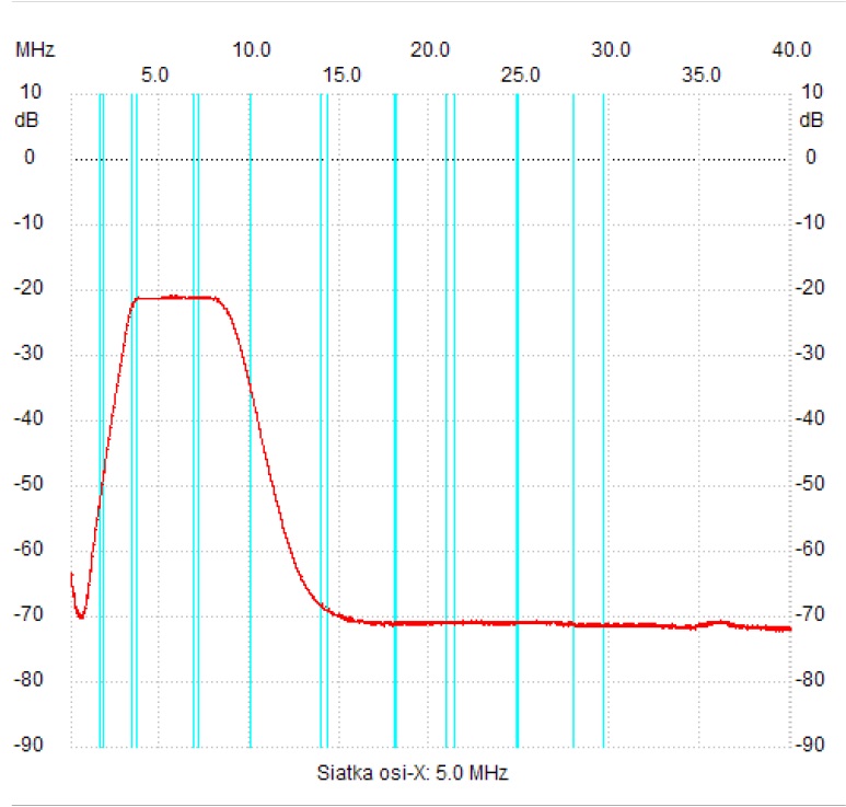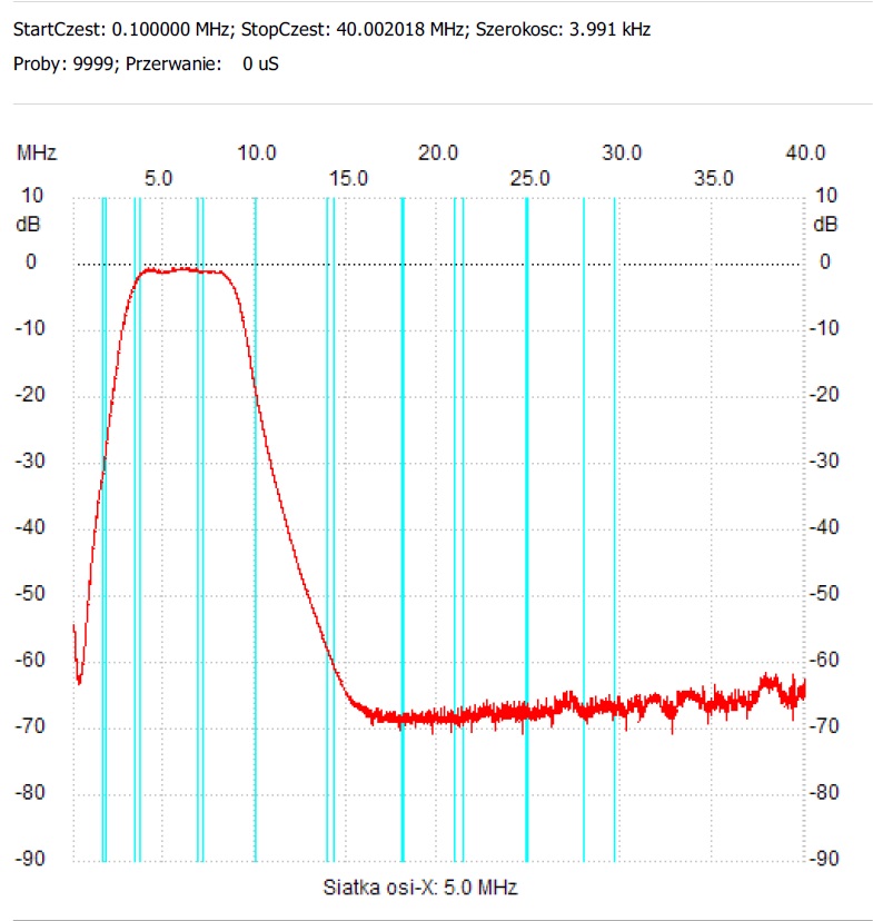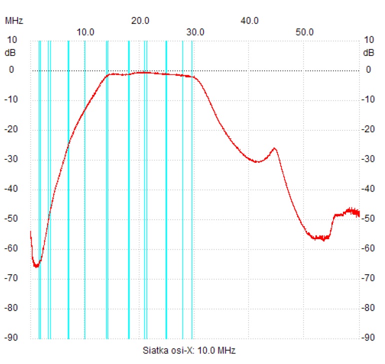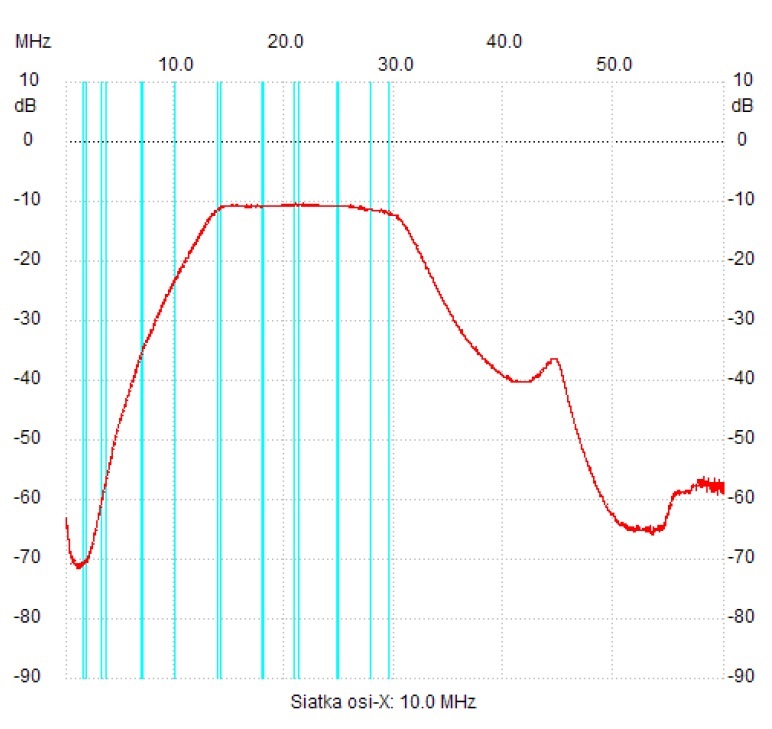 Sam filtr wygląda nieźle, natomiast okolice 45 MHz sugerują albo mimo wszystko coś z filtrem (kondensator?) albo wzbudzenie , albo coś z NWT7. Włączyłem zatem tłumik 10 dB w NWT i dostałem taki przebieg: