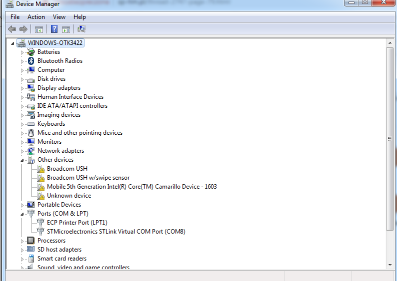 Jeśli brak driverów - w menadżerze urządzeń pojawią się 2 nowe pozycje: Nieznane urządzenie i ST-Link Debug