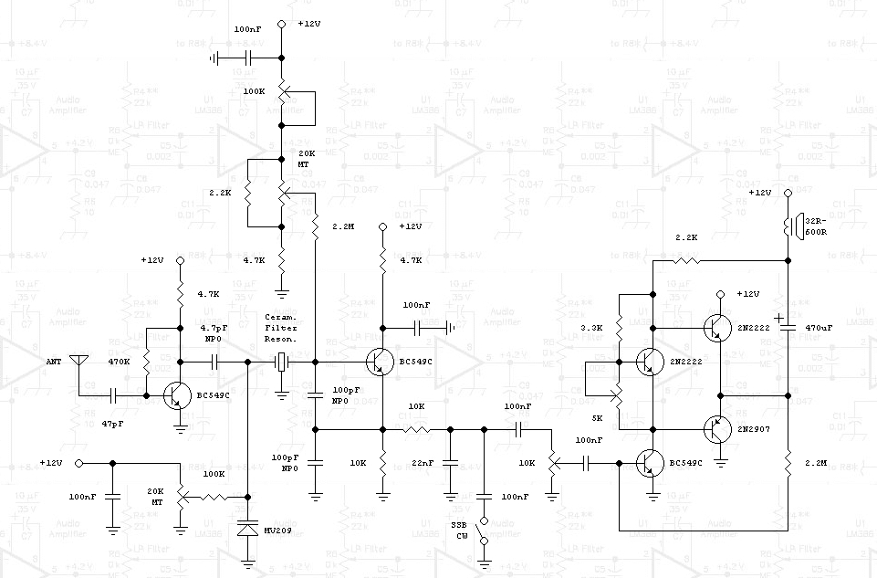 Wydaje się, ze takie połączenie pierwszego stopnia z drugim ma jednak pewne uzasadnienie bo sygnał z szeropasmowego, pierwszego stopnia, jest filtrowany w kierunku bazy generatora właśnie przez filtr ceramiczny generatora wykorzystywany jednocześnie do generacji. Jak sądzę, to pomysł autora na zwiększenie selektywności na wejściu.