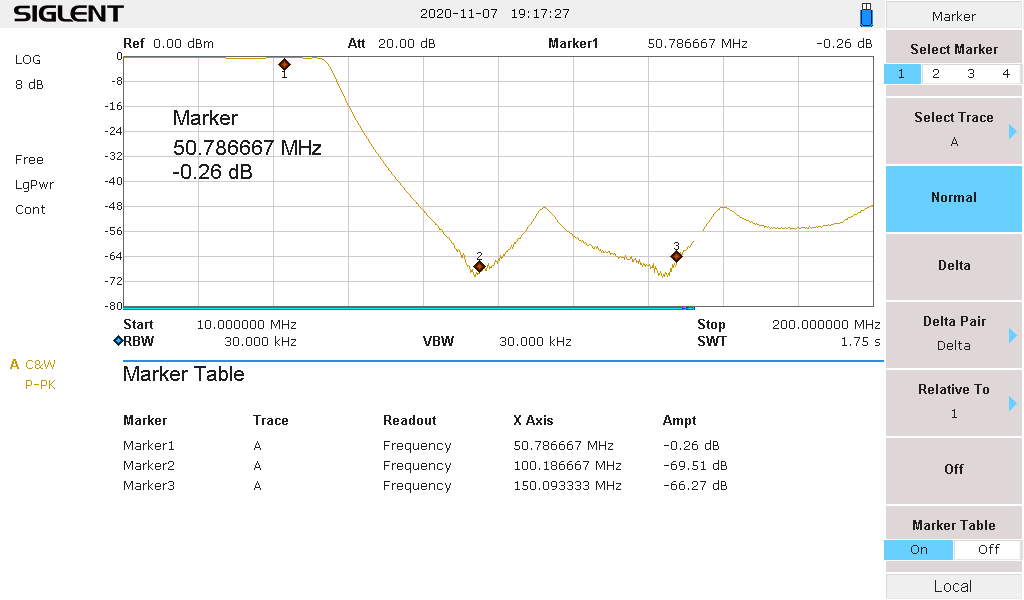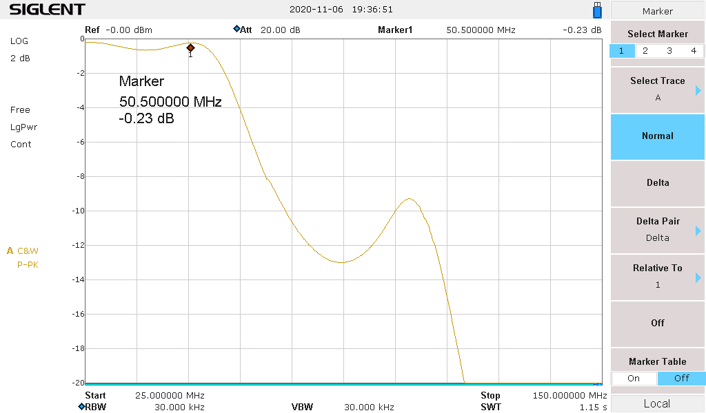 Podałem sygnał z trxa K3. Moc ustawiona na 4 Waty. Napięcie wejściowe mierzone na wejściu tłumika 4 dB (rezystory 10/100/10 Ohm). Pomiar wykonany oscyloskopem cyfrowym z kalibrowaną sondą 1:10. Wartość RMS. Jak widać napięcia wejściowe nieznacznie się różnią w zależności od pasma, ale jest to normalne zjawisko szczególnie przy tak małej mocy TRXa. Swr nie przekroczył wartości 1:2 nawet na 50 MHz. Jak dojdzie 10 dB tłumik mocy to w zasadzie obciążenie trxa będzie idealne. Transile + diody (17V) w tłumiku ograniczają przebieg dla mocy 5 wat, diody Zenera w bramkach nie mają nic do roboty. Przy tej mocy napięcie na bramce wynosi około 9v PP. Oczywiście niech zostaną, zawsze są dodatkowym zabezpieczeniem przy silniejszym piku mocy sterującej.