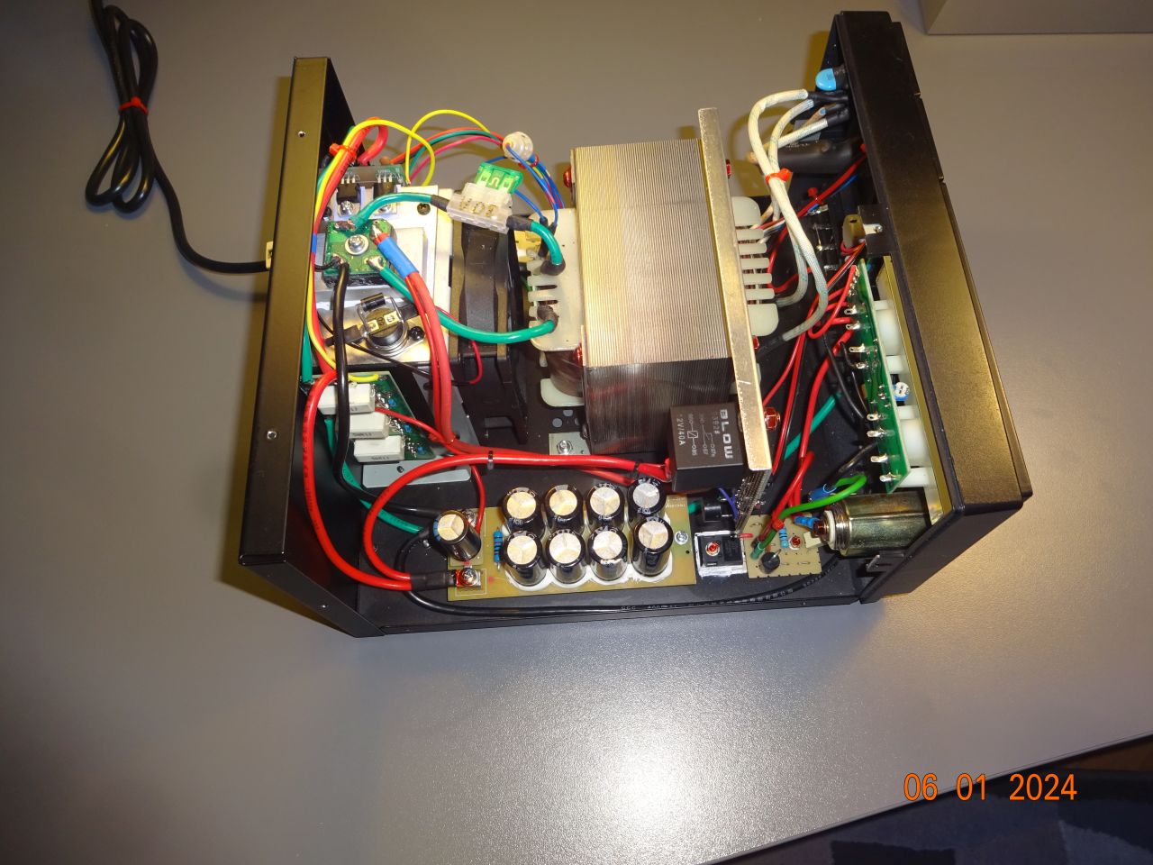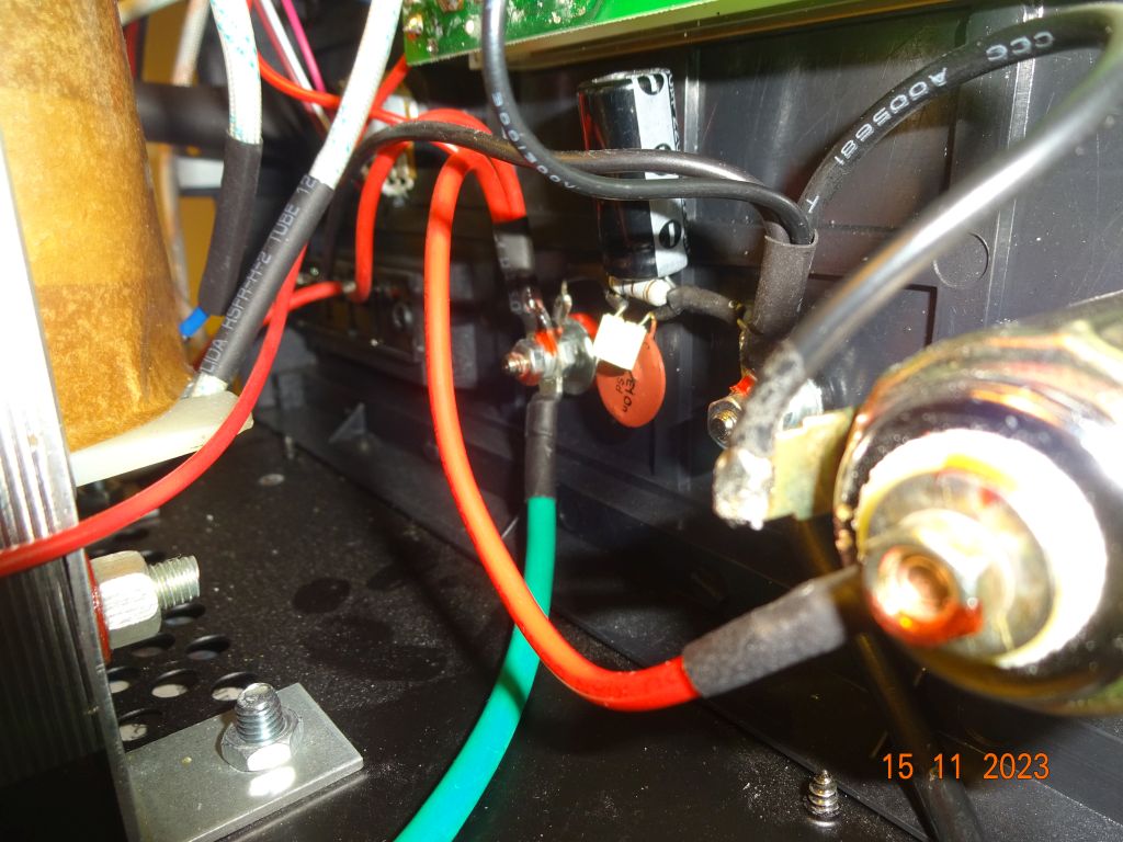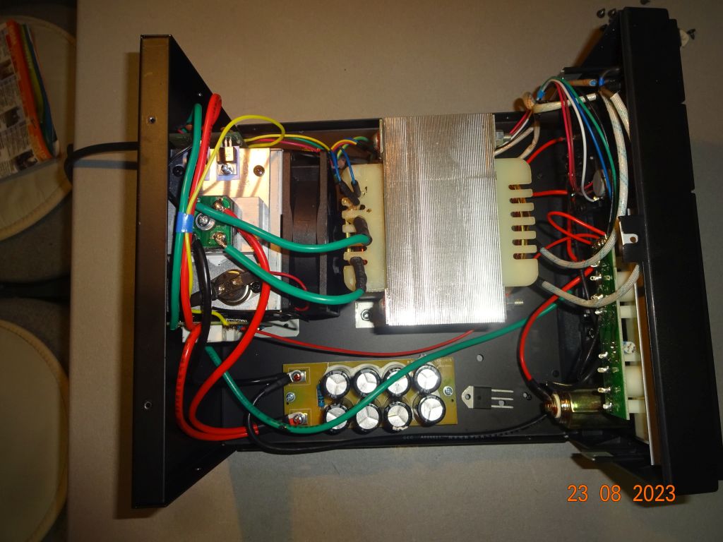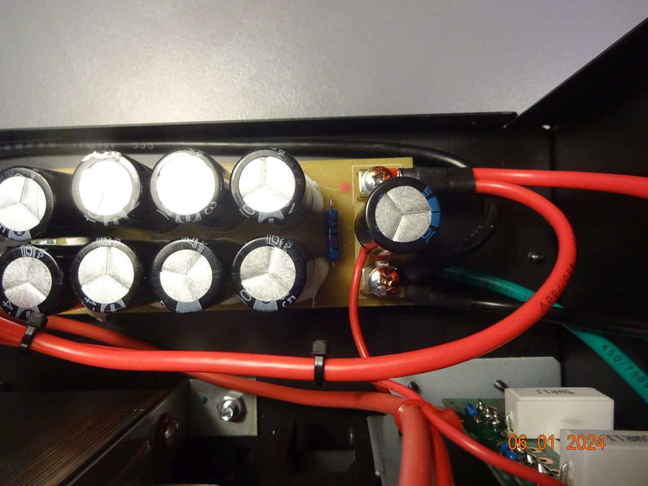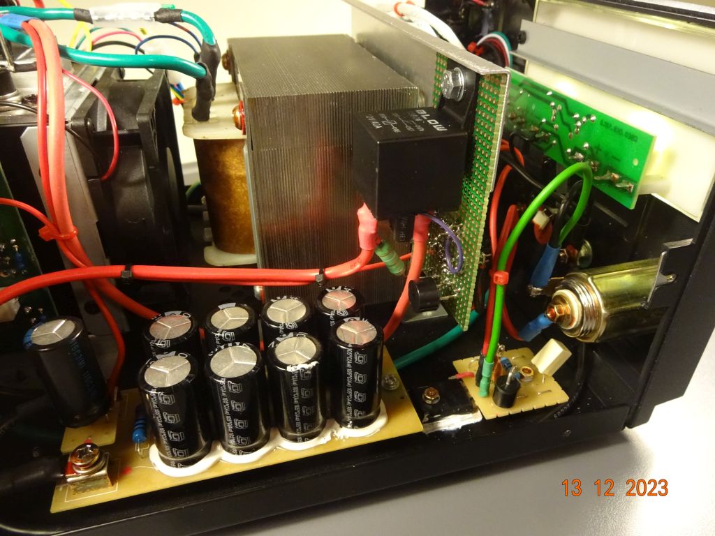 ..): na włączniku zasilania kondensator 10nF/3kV, którego nie było (jest na schemacie z internetu, równolegle do uzwojenia pierwotnego), kondensatory 10nF+0,1uF do kondensatorów elektrolitycznych (8x4700uF) po mostku prostowniczym (od strony druku) i na wyjściu zasilacza bezpośrednio na zaciskach. Był tam już kondensator elektrolityczny i rezystor obciążający wstępnie wyjście zasilacza.