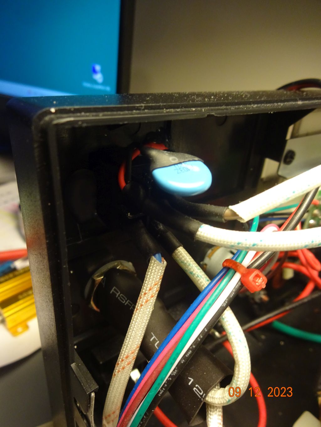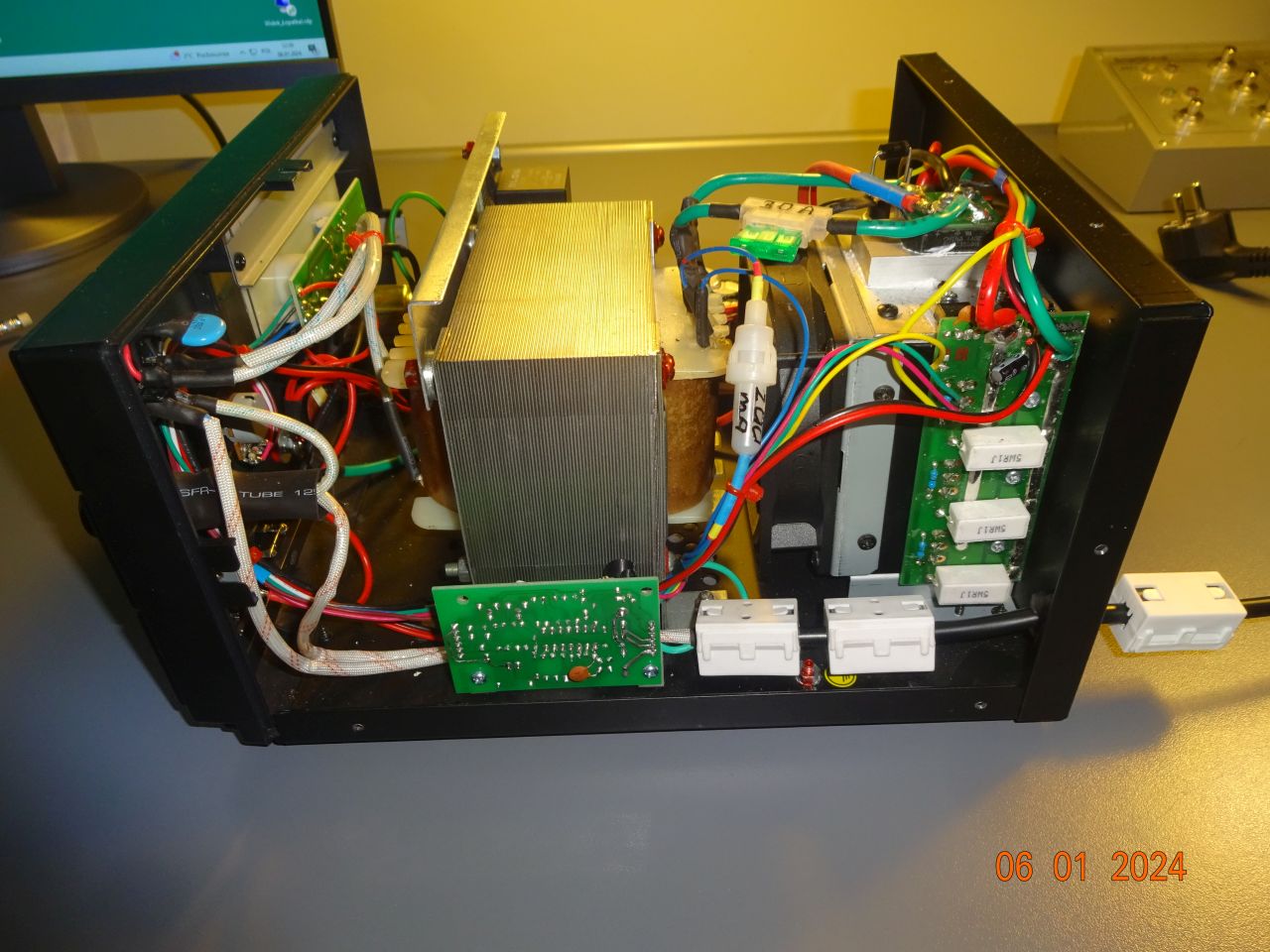 Zdjęcia zasilacza po zdjęciu obudowy (na jednym z nich widoczny zabłąkany tyrystor przymierzany do układu CROWBAR), zdjęcia z modyfikacjami w tym z modyfikacją termostatu.