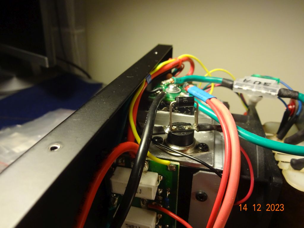 U mnie również występowało to zjawisko. W związku z tym postanowiłem dokonać prostej modyfikacji opisanej na mods.dk. Polega ona na wlutowaniu diody zenera równolegle do termostatu bimetalicznego zainstalowanego na radiatorze do którego przykręcone są tranzystory mocy wykorzystywane w zasilaczu. Przed modyfikacją po przekroczeniu temperatury zadziałania termostatu i zwarciu jego styków następowało podanie napięcia 12V (z układu 7812) na wentylator. Schładzał on cały układ (radiator+ termostat) do momentu przy którym następuje rozwarcie styków i wyłączenie wentylatora. Wentylator pracował w trybie przerywanym. Po modyfikacji wentylator działa w sposób ciągły. W sytuacji gdy styki termostatu są rozwarte na wentylator podawane jest obniżone napięcie (12V minus napięcie spolaryzowanej zaporowo diody zenera w moim przypadku 12V – 6,2V). Przy obniżonym napięciu wentylator pracuje cicho z akceptowalnym poziomem hałasu. Gdy temperatura układu zaczyna rosnąć (np. nadawanie) następuje zwarcie termostatu i podanie 12V na wentylator, zaczyna on pracować z pełna mocą. Przy odbiorze (pobór prądu ok. 4A) wentylator nie wchodzi w tryb pełnej mocy.