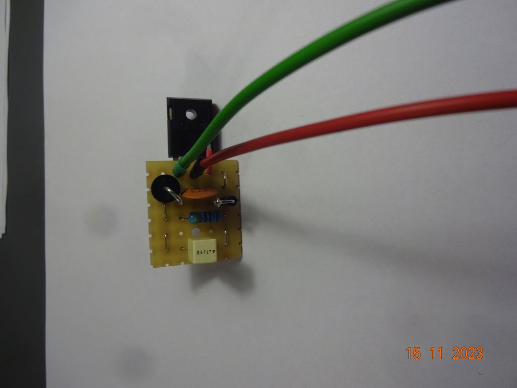 Zastosowałem diodę zenera 6,2V/5W. W trakcie pracy robi się ona ciepła (ale nie gorąca). Żeby nie podgrzewać czujnika i wpływać na jego działanie, jej doprowadzenia zostały wygięte w połowie długości w kształt litery „U” a następnie bez skracania przylutowane bezpośrednio do termostatu. Tworzą radiator oprowadzający ciepło wytwarzane prze diodę.