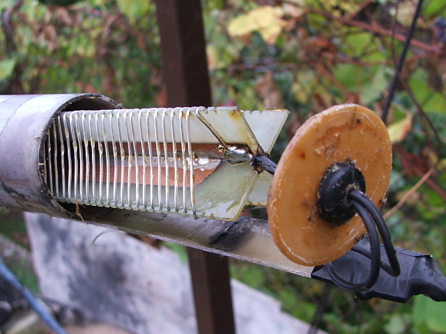 Antena pracuje doskonale na wszystkich pasmach najważniejsze to wykonać dobrze trapy.Strojenie zaczynamy od 7 dołączamy trapy i ramiona na 3.5 i stroimy ponownie.Trapy nie wolno nawijać Z/Z-ma być ze skokiem (pojemność m/zw) rozwala antene i mamy dwu pasmową.Tak wyglądają trapy po ???chyba 20 latach hi. Jak wykonamy perfekcyjnie trapy to i antena będzie b/dobrze pracowała.Wisi jak inverted V jest symetryzator.Symetryzator skraca ramiona!!!Nie kombinować z pojemnością trapa ma być 60pF+-1pf strojona pojemność na mostku. a trap na 7.050 SWR na 7 nie mierzalny.po końcach nieco ponad 1,15 w nowej części 7 ,2Mhz 0k 1.3. Zabezpieczone trapy plasteliną -szkolną żadne inne wynalazki. Trapy-uzwojenie polakierowane i utwardzone -lakierem odpornym na aerozol morski,pojemność trapu stanowi laminat dostrajany przez docinanie. kabel 75om dopasowuje skrzynką sp6syv do trx-a 50om Swr między skrzynką i nadajnikiem nie mierzalny. Najgorzej jest na 28 po pierwszej 500khz ( 1.5)zaczyna szybko rosnąć. Ramiona wykonane z drutu DNEok 3mm.