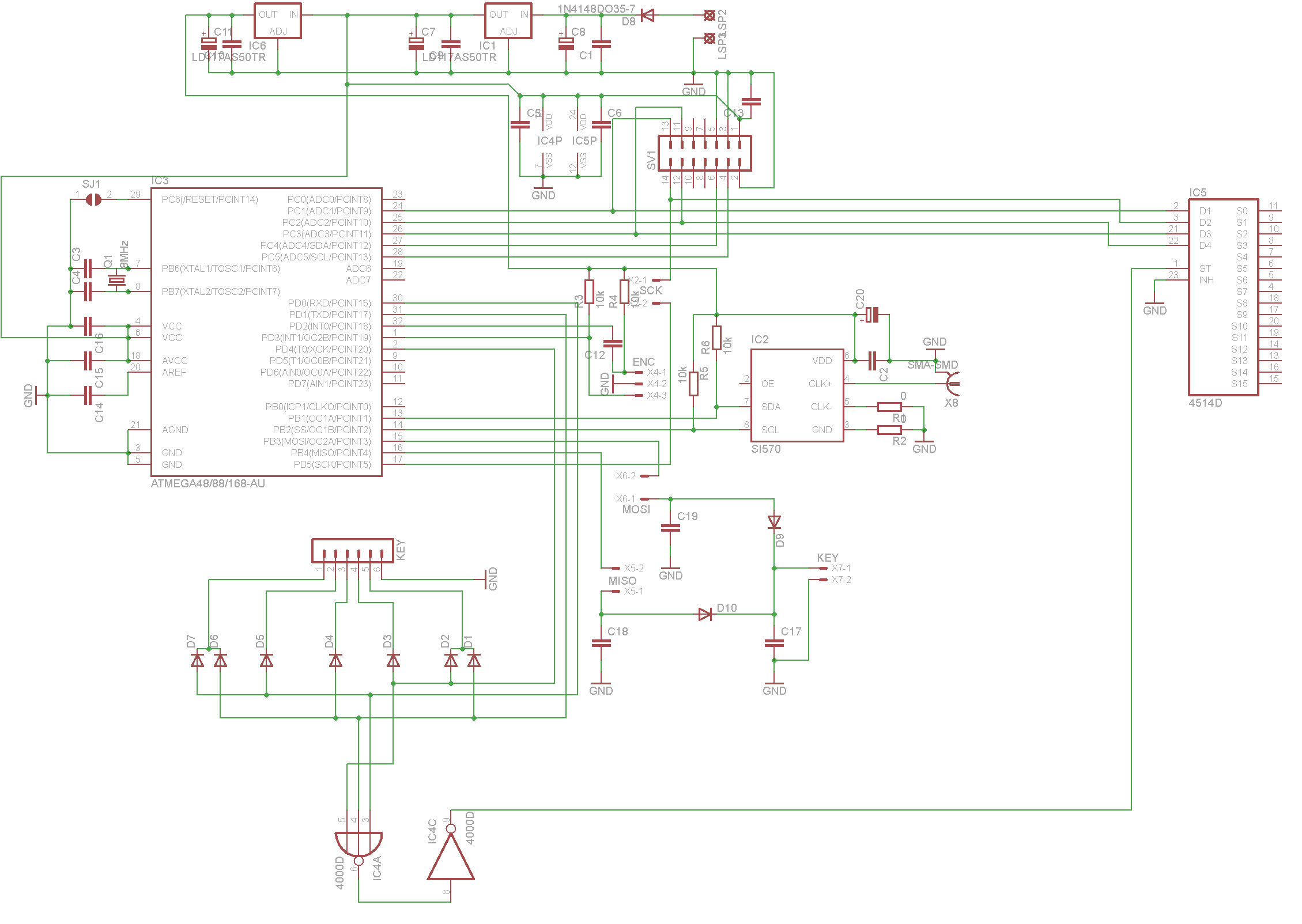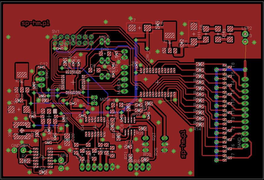 Uwaga na niebieską warstwę spodnią oraz samotne "wysepki" GND. Napisy MOSI i CW_K są przesunięte i lepiej opierać się na schemacie.