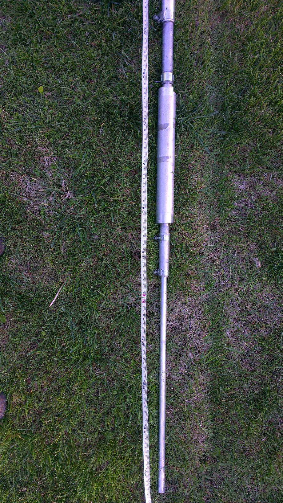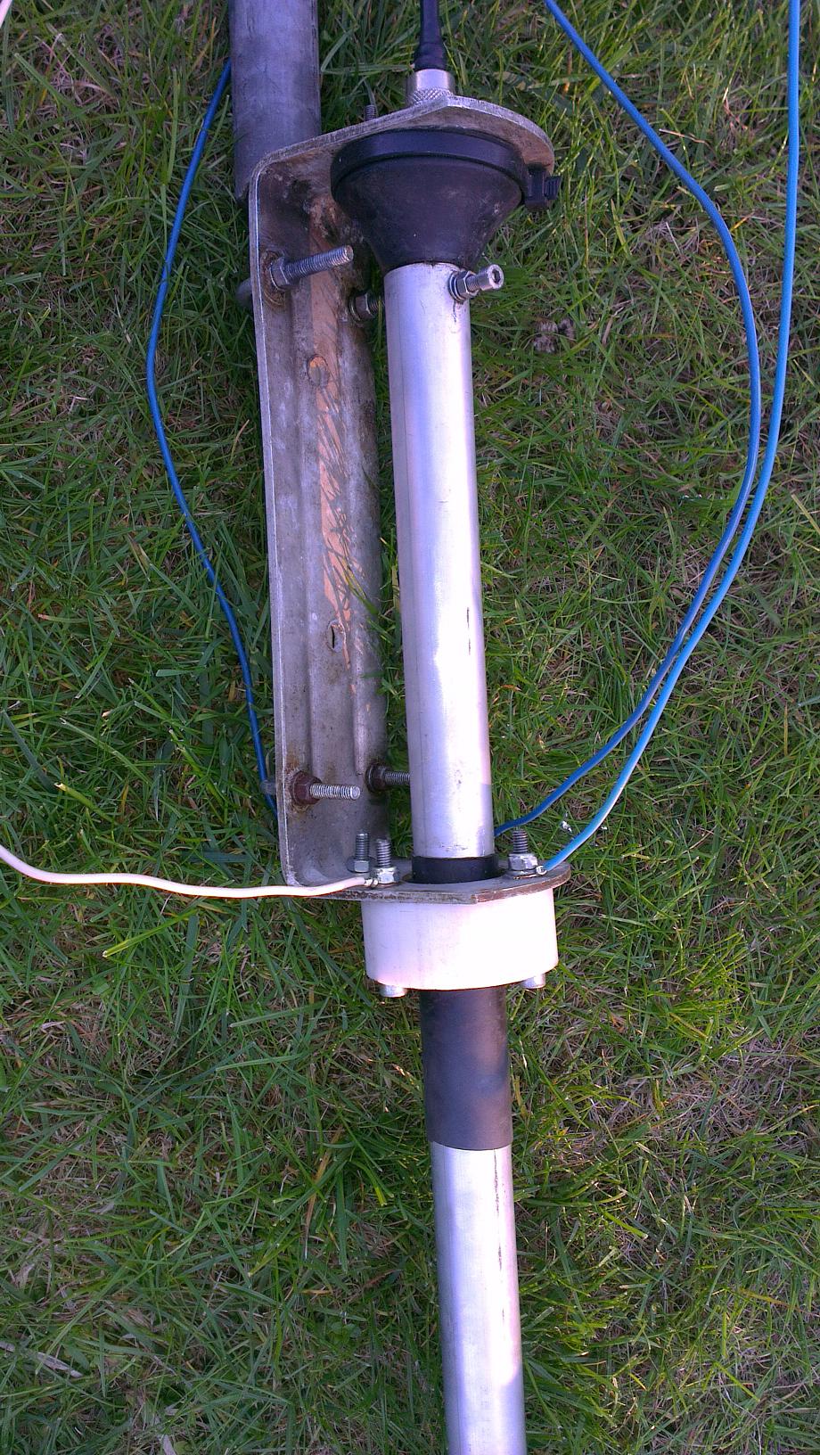 Na mocowanie i punkt zasilania wykorzystałem dolną część ze starej anteny CB 1/2. Wykonałem z teflonu nowy górny pierścień, gdyż stary był po pierwsze popękany a po drugie nie wchodziła przez niego rura 30x2mm. Na odcinku przejścia przez pierścień dałem dodatkowo kawałek dętki w celu zlikwidowana luzu w otworze. Oryginalna najniższa rura z anteny 1/2 byłaby za krótka stąd konieczność zastosowania dodatkowej dolnej przedłużającej rury fi30mm. Dopiero do tej rury wsunięty jest oryginalny fragment z 1/2, o wymiarach 26x1mm i do tej rury spasował idealnie trap swoją zewnętrzną średnicą montażu 22mm.