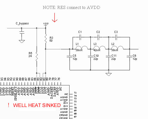 2. Ten drugi rezystor 100 Ohm, co do którego masz zastrzeżenia, stanowi wraz z pierwszym rezystorem 100 Ohm (obciążenie dla IOUT) wymagane dopasowanie 50 Ohm dla filtru.