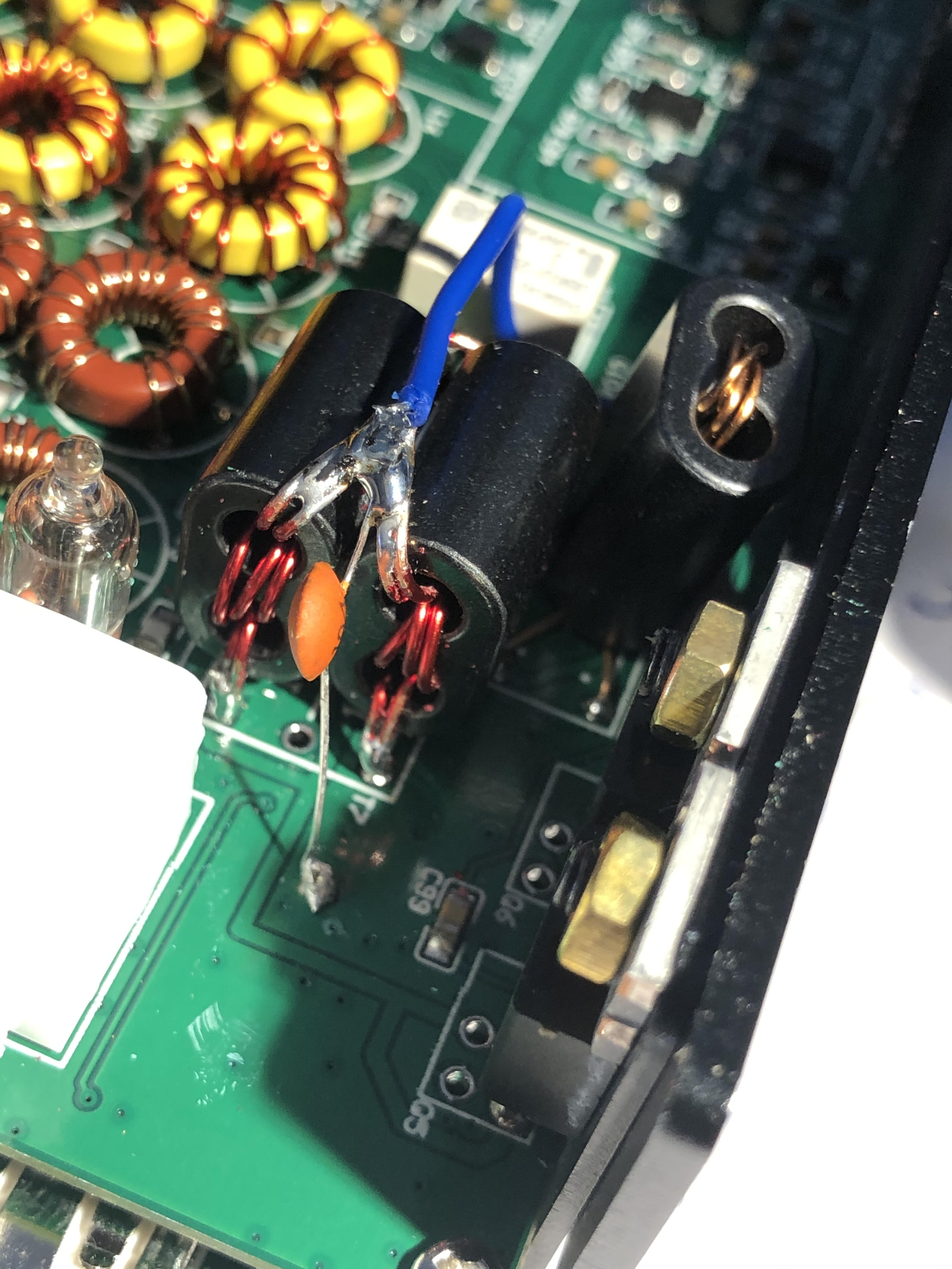 Zrealizowałem na wstępie modyfikację T7 według S54AM na dwóch rdzeniach, wersję z dwoma równoległymi drutami zamiast oplotu coaxa dla pierwotnego uzwojenia. Musiałem zredukować pierwotne ustawienie PA Bias o 3 punkty, ale pobór prądu i tak się zwiększył. W oryginale I(rx) = 360mA teraz 395mA.