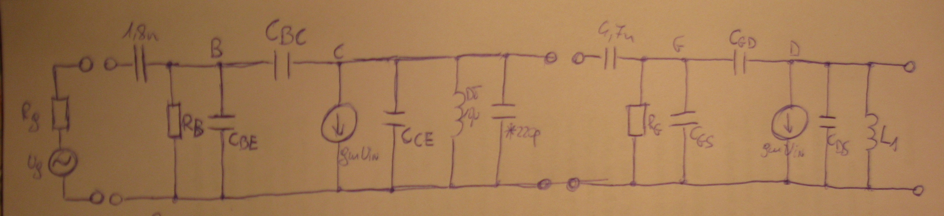 Jest to bardzo zgrubne oszacowanie, słuszne jedynie dla niskich częstotliwości, ale moim zdaniem wystarczające dla naszych radioamatorskich celów. Na wyższych częstotliwościach, a nawet już przy niskich, ale dużych mocach widoczny jest wpływ indukcyjności nóżek tranzystora (+ to co w środku). Szczególnie duże znaczenie ma indukcyjność źródła, gdyż tam podobnie jak w przypadku rezystora źródłowego powstaje sprzężenie zwrotne prądowe. Z tego też powodu specjalne tranzystory przeznaczone do pracy na wysokich częstotliwościach mają często wyprowadzenia źródeł i emiterów w postaci szerokich blaszek, często złoconych.