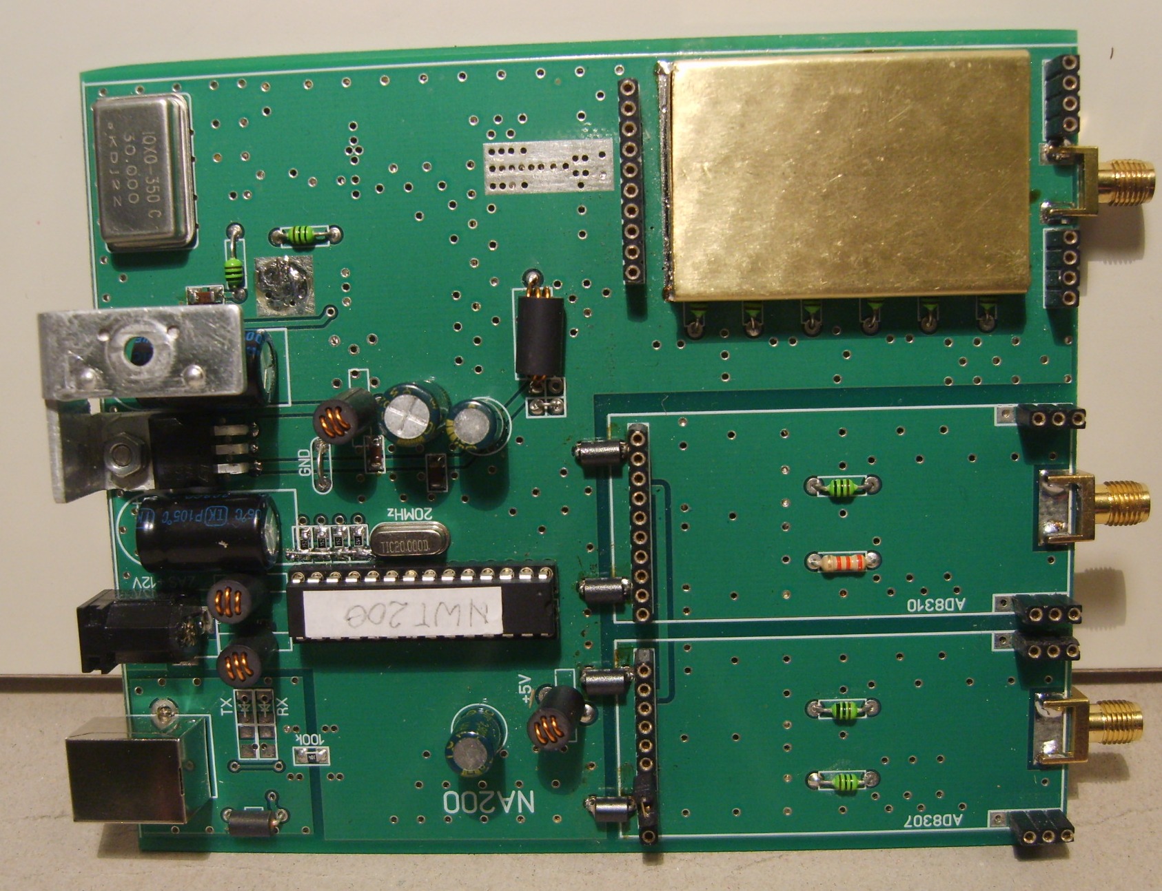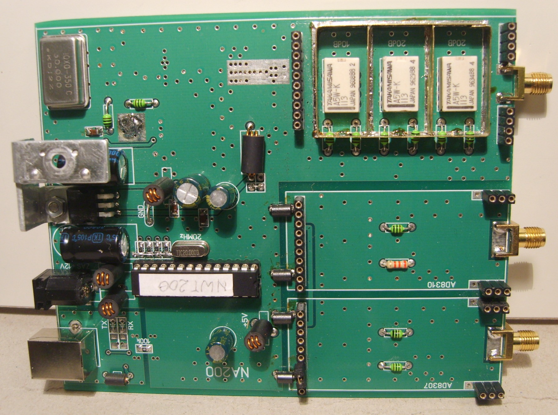 To samo dotyczy wzmacniacza wyjściowego. Na płytce znajdują się złącza pozwalające umieścić nad przekaźnikami moduł z innym wzmacniaczem sygnału wyjściowego. Jeśli ktoś chce oraz umie zbudować i uruchomić przeciwsobny wzmacniacz Nortona chodzący do 200MHz to ma taką możliwość.