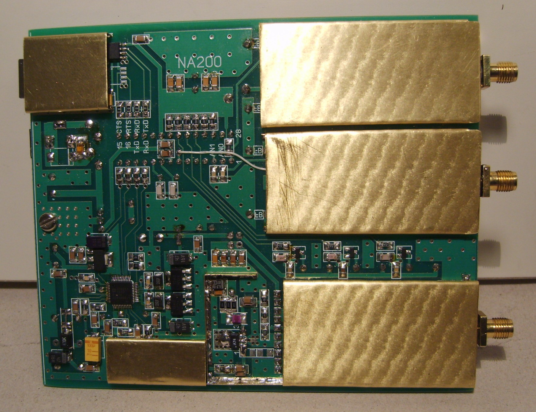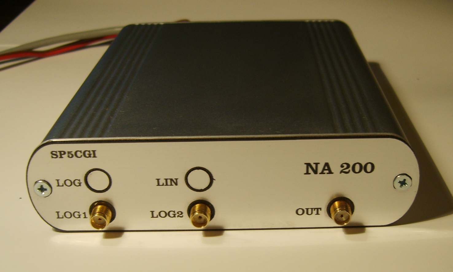 Mój NA150 (pasmo 150 MHz bo taki posiadałem fabryczny filtr Coilcrafta) już działa. Do dokończenia zostały ekrany na modułach, oraz wykonanie sondy liniowej. Ale już teraz wyniki są więcej niż bardzo dobre. Wzmacniacz na SGA7489 pracuje z prądem 140 mA. ( 5x220 Om 0.7W a i tak się nieźle grzeją) Poziom sygnału na wyjściu +10 dBm. Przed i za wzmacniaczem znajdują się stałe tłumiki 3dB. Urządzenie pobiera 310 mA z 12V zasilacza ( gdy załączone przekaźniki tłumików ok 400mA). Stabilizator liniowy 7805 dosyć mocno się grzeje. Wymagane było skuteczne odprowadzenie ciepła na ściankę tylną przez miedziany łącznik. Zastosowanie metalowej tylnej ścianki wiązało się z odizolowaniem za pomocą rurki termokurczliwej gniazda USB.