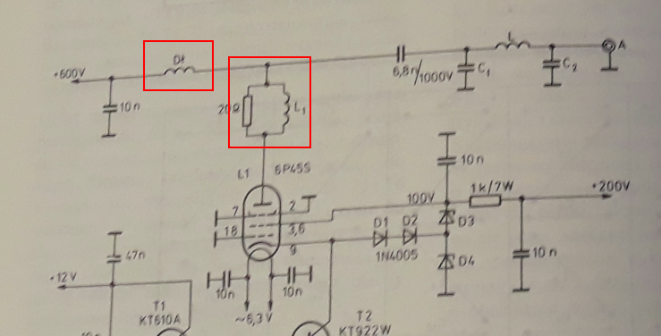 1. Na oporność w obwodzie anody. Przy wyłączonych napięciach i rozładowanych kondensatorach w obwodach anody i siatki 2 zmierz omomierzem oporność pomiędzy anodą a punktem skąd pobierane jest napięcie anodowe. Oczywiście oporność ta nie powinna być większa niż oporność dławika anodowego i filtrującego a więc kilka, kilkanaście omów. Na rysunku zaznaczyłem najbardziej podejrzanych ;-)