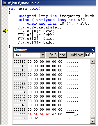 Widać że Zmienna FTW.u32 zmienia 4 bajty pamięci, a zmienna FTW.u8[x] po jednym bajcie wybranym przez index tablicy "x".
