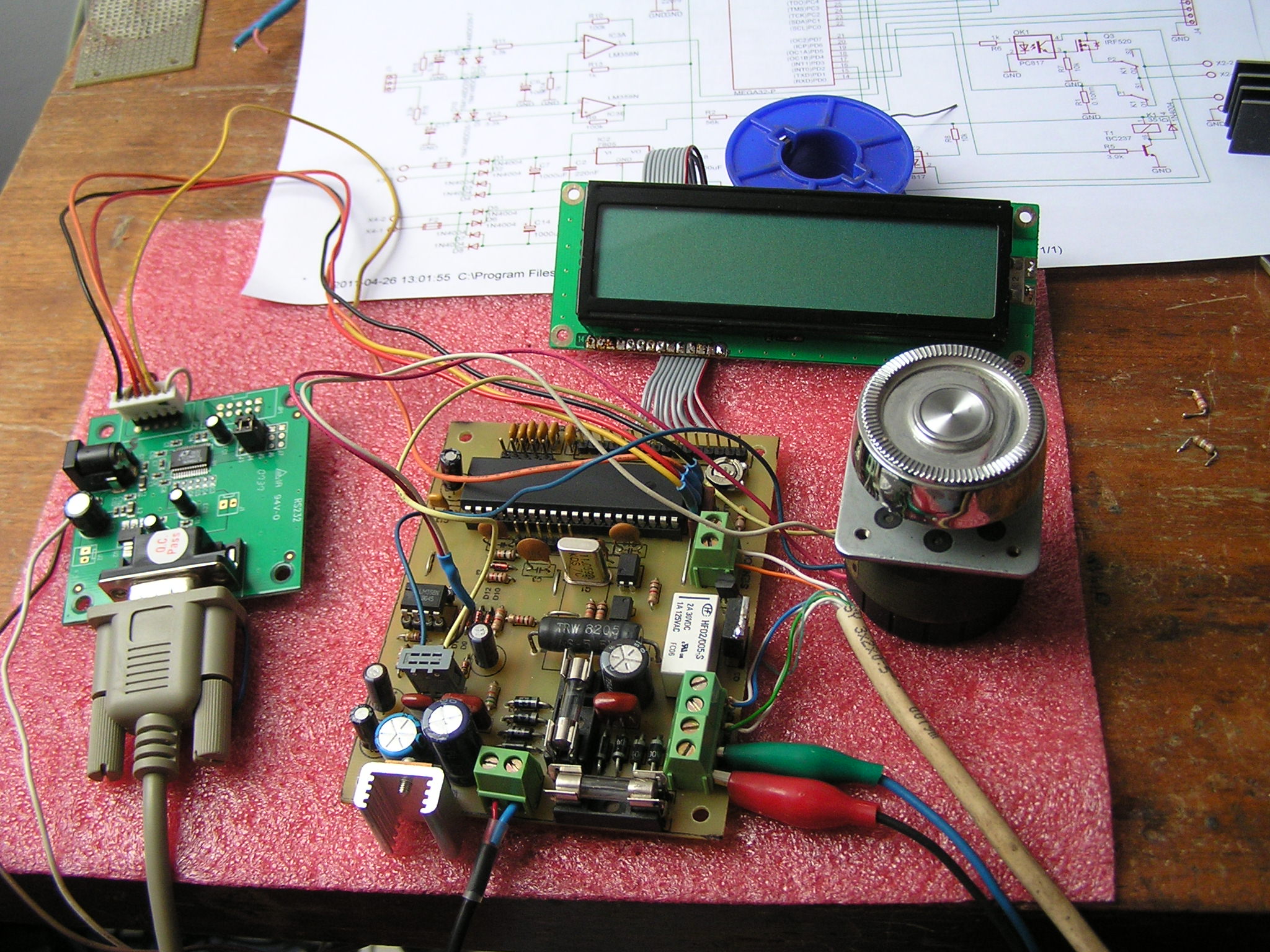 Urządzenie składa się z wyświetlacza, procesora Mega32, silnika krokowego 200kroków/obrót w roli enkodera zadanego położenia, wzmacniacza impulsów z enkodera oraz dwóch przycisków i kilku elementów.