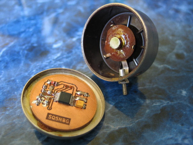. Wyprowadziłem także dodatkowe pola, które mogłyby służyć do detekcji przesunięcia magnesu (działanie jak przycisk) ale nie wyprowadziłem ich w końcu na zewnątrz obudowy enkodera. Jako bazę mechaniczną również wykorzystałem potencjometr. Jest on trochę większy od potencjometru Romana, ale zaletą jego jest prostota wykonania - wystarczy odgiąć kilka blaszek, odkręcić śrubki i wszystko pasuje. Jedynie większą pracą było wyfrezowanie otworu na złącze szpilkowe. Co do płytek, to posiadałem akurat takie koliste i pasujące! kawałki laminatu. Magnesik dodatkowo posmarowałem butaprenem, chociaż od początku przylegał do zakończenia osi potencjometru. Płytkę także przykleiłem butaprenem do zdejmowanej ścianki.