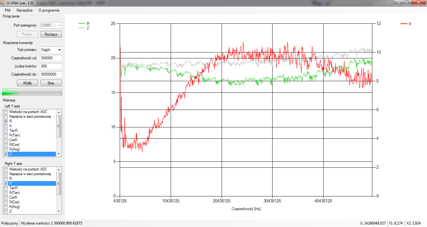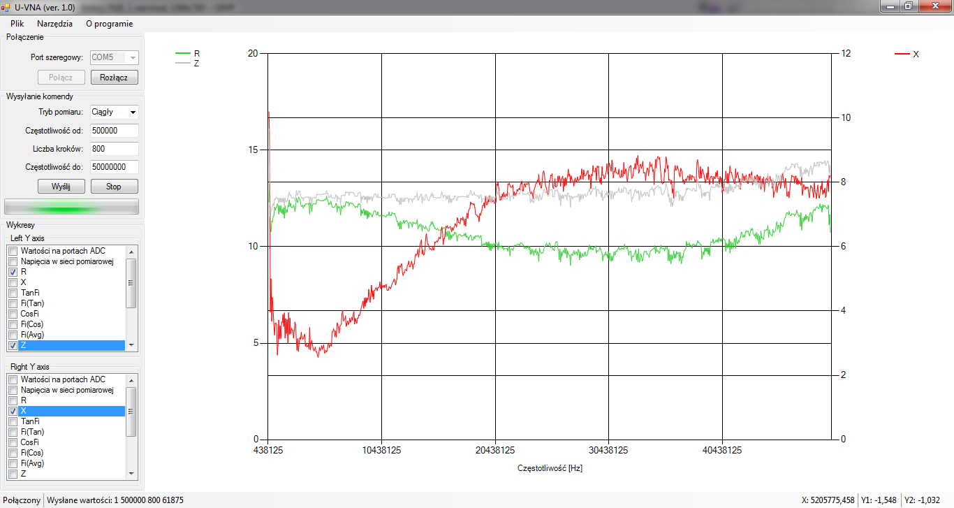 Otóż, z obliczeń (szczególnie dla portu otwartego) wychodzą często bardzo duże lub bardzo małe wartości. Co ciekawe, typ "double" w C# pomieści nawet nieskończoność (będącą wynikiem dzielenia dowolnej wartości przez zero - operację w matematyce niedozwoloną, ale w praktyce oznaczającą dzielenie przez nieskończenie małą wartość), ale niestety nie da się jej przedstawić na wykresie. Dlatego też wszelkie "nieskończoności" (dodatnie lub ujemne) sprowadziłem do pewnych określonych (ale ciągle dużych) wartości, aby je móc zobrazować na wykresach. Przyjąłem int.MaxValue i int.MinValue - stąd te +-2 miliardy, ale należy je wtedy rozumieć jako +-nieskończoność (jak w Twoich założeniach w mierniku Na02). To jednak nie zmienia faktu, że duże impedancje ciągle mogą być mierzone (wykres dla 1k poniżej) - jeśli tylko zostanie rozwiązany główny problem pomiarów...