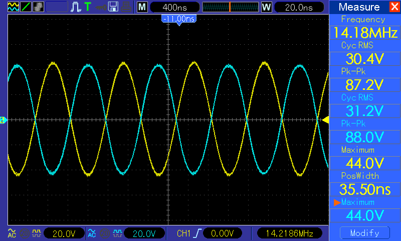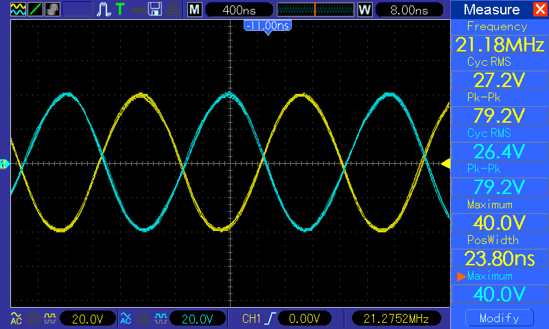 oscylogramy - żółty przebieg po LPF, niebieski po trafie wyjściowym.