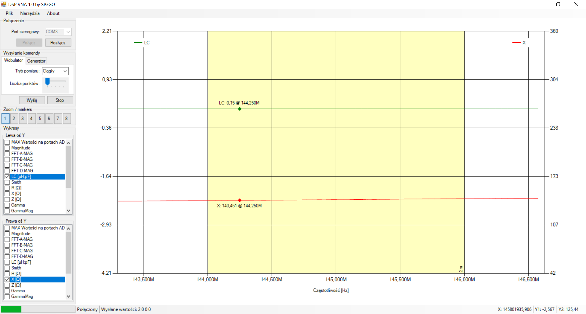 Poniżej na szybko zrobione pomiary (przez ten sam metrowy kabel pomiarowy). Na lewej osi indukcyjność w uH (wartość dodatnia pomiaru "LC" mówi, że jest to indukcyjność i wyrażona w uH, a wartość ujemna mówi, że jest to pojemność wyrażona w pF), a na prawej osi reaktancja:
