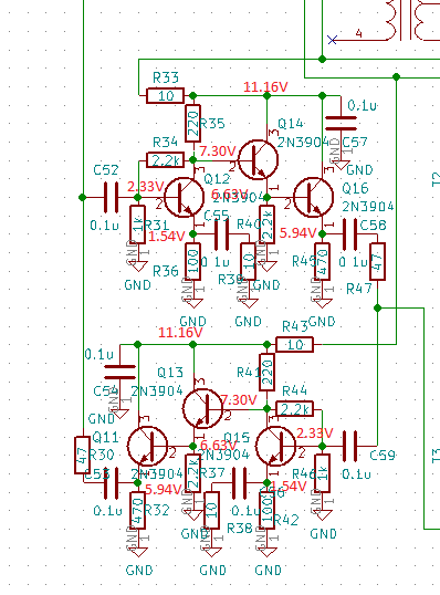 Ponieważ napięcia obu wzmacniaczy podane na schemacie są bardzo prawdopodobne dla poprawnie działającego układu to wstępnie założyłem, że oba układy działają prawidłowo.