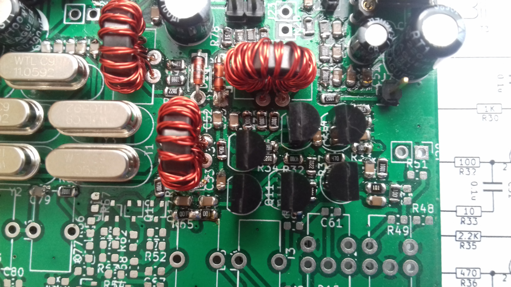 Następny blok funkcjonalny urządzenia to wzmacniacz sygnału pośredniej częstotliwości 11.059MHz. Ten układ, podobnie jak wzmacniacz pośredniej 45MHz, zbudowany jest lustrzanie dla sygnału nadajnika i odbiornika a kierunek wzmocnienia określa napięcie zasilania aktywujące odpowiednie tranzystory. W torze odbiornika pracują Q15, Q13 i Q11 a w torze nadajnika Q12, Q14 i Q16. Napięcia dla części nadawczej należy mierzyć kiedy urządzenie znajduje się w trybie nadawania co uzyskuje się łącząc styk T/R z napięciem 12V za pomocą opornika co najmniej 1k.