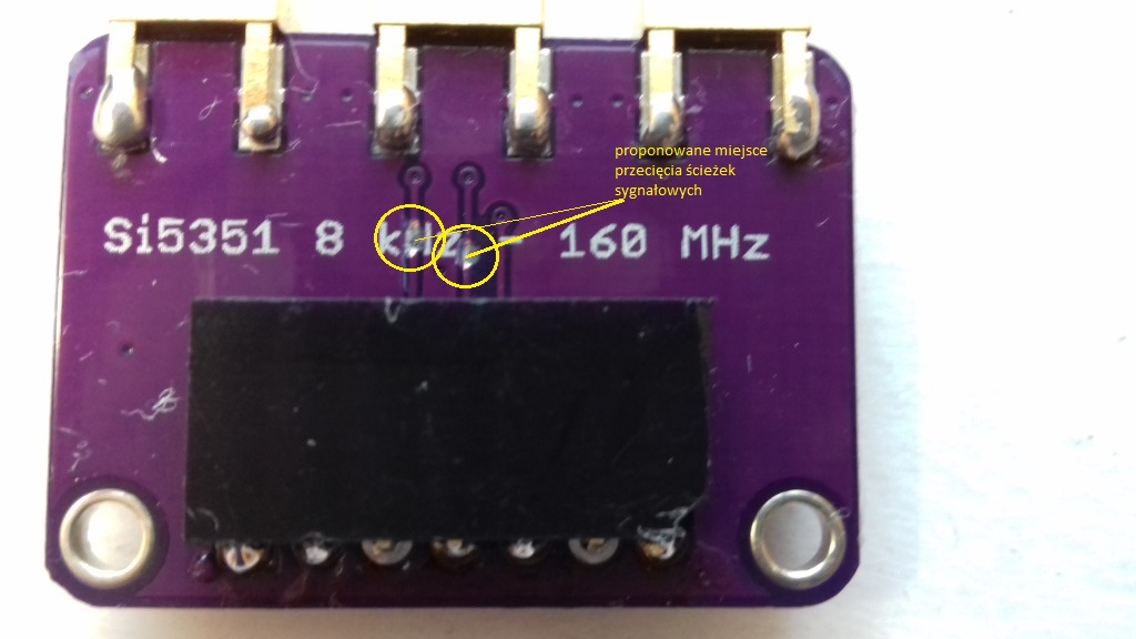 Zabrakło tam dość istotnej informacji o konieczności przystosowania tego gotowego układu do połączenia z płytką sterownika. Taki generator jak na rysunku ma wyprowadzenia sygnału zarówno na złącza SMA jak i na piny łączówki. Jedynie jeden z tych sygnałów 'ma szansę' pojawić się na łączówce ponieważ inaczej ustawiona była sygnalizacja dla AD9833. Dlatego, należy wykonać korekty druku na oryginalnej płytce: