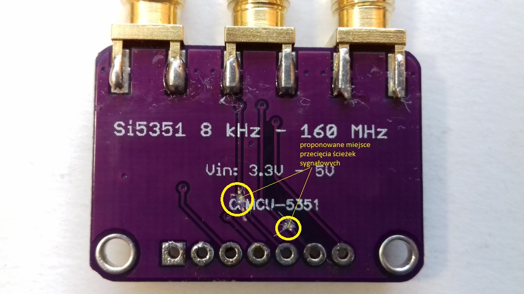 Przecinając ścieżki jak pokazałem zapewnia się, że sygnały dwóch generatorów nie będą zwarte na łączówce modułu generatora. Trzeci sygnał nie wymaga takiej korekty. W ten sposób sygnały z generatorów wyprowadzone są prawidłowe na ścieżki do złącz sma. Ja używam zarówno złącz jak i kabli zakończonych wtykami sma ale można kable sygnałowe dołączyć wprost do pól lutowniczych złącz sma. Montując zespół piny/gniazdo dla generatora Si5352 proszę zachować pokazane na zdjęciach ułożenie wzajemne pinów i gniazda albo zastosować świadomie własne ułożenie tak, aby nie nastąpiło odwrócenie sygnałów na złączu. Projektując sterownik dla AD9833 nie miałem pojęcia, że nada się on (ze zmianami jak wyżej) do Si5351 i uBITX-a . Stąd wynikłe kompromisy.