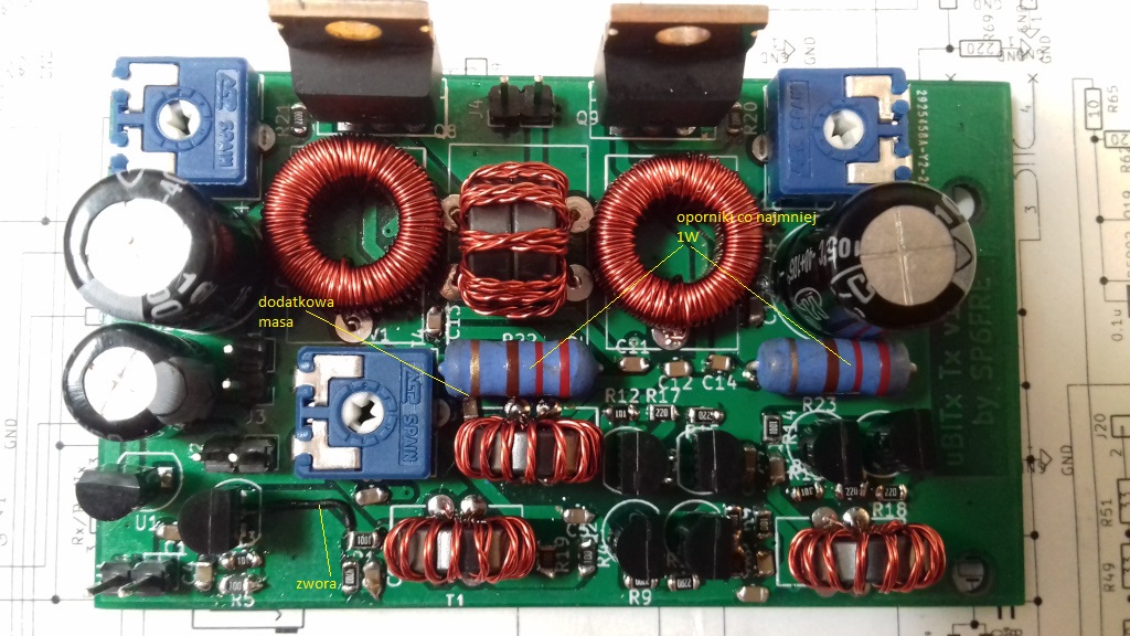 Na schemacie można znaleźć oporniki o wartościach 2.2 oma, ponieważ nie miałem takich, to użyłem wszędzie tam zamiast tej wartości, dwóch złożonych na kanapkę oporników 10 omów (lutując jeden na drugim) co w sumie daje ok. 5 omów. Dotyczy to oporników R5, R6 i R19 i w zasadzie nie powinno (poza niewielkim wpływem R5) mieć znaczenia.