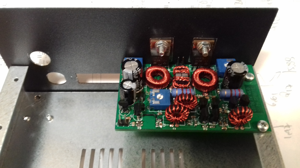 Tranzystory mocy należy dołączyć do radiatora (tu płyta tylna obudowy) pamiętając o niezbędnej izolacji za pomocą podkładki oraz tulejki izolacyjnej pod śrubę. Docelowo, na tylnej płytce obudowy zamontuję niewielki radiator aluminiowy. Testując układ osiągałem prąd do ok. 1.5A co oznacza kilkanaście W mocy doprowadzonej do stopnia końcowego a więc jest co chłodzić.