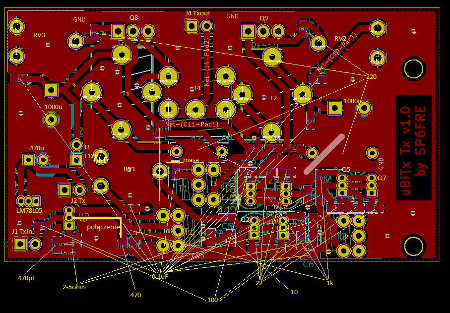 Na schemacie zaznaczyłem okręgami miejsca błędów - w przypadku bazy tranzystora Q1 nie zauważyłem na schemacie, że oporniki polaryzujące R1, R2 nie maja połączenia z bazą i na płytce również nie ma tego połączenia. Trzeba to zrobić dodatkowo, ja użyłem niewielkiego odcinka kynaru co widać na zdjęciach płytki.
