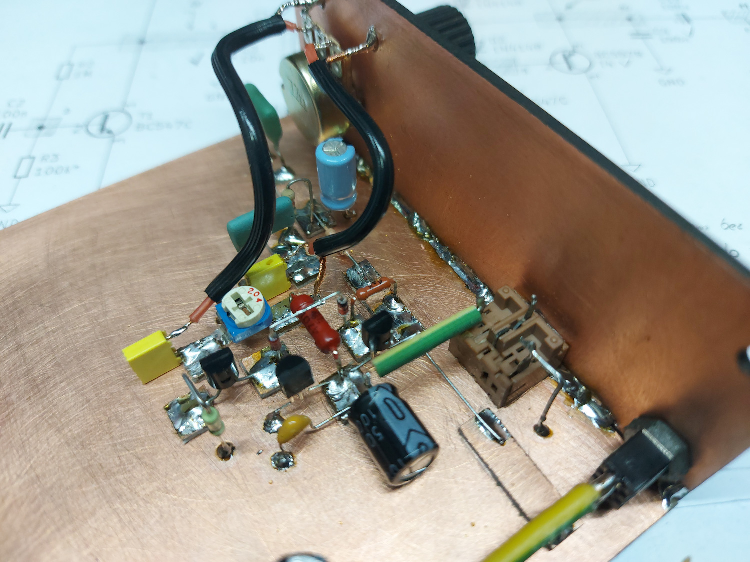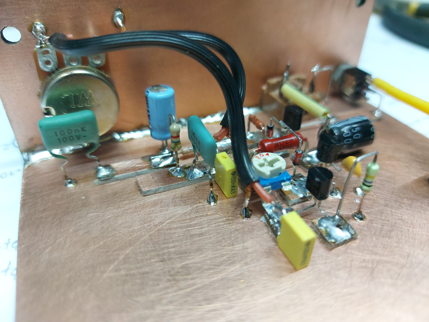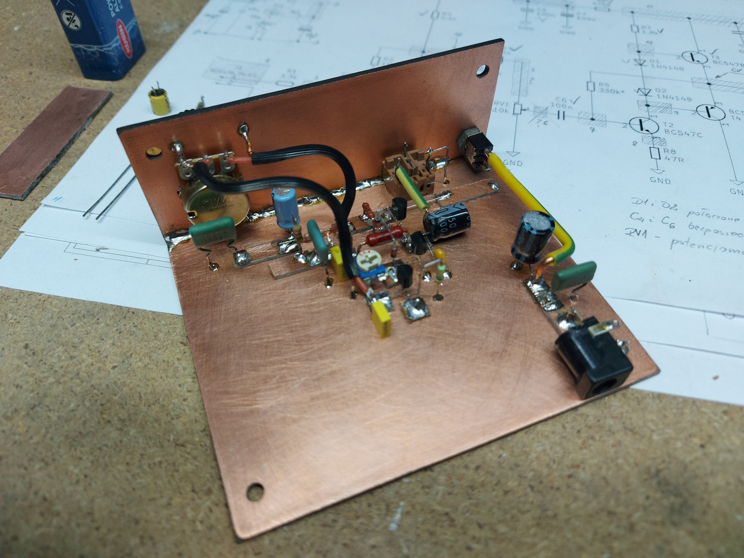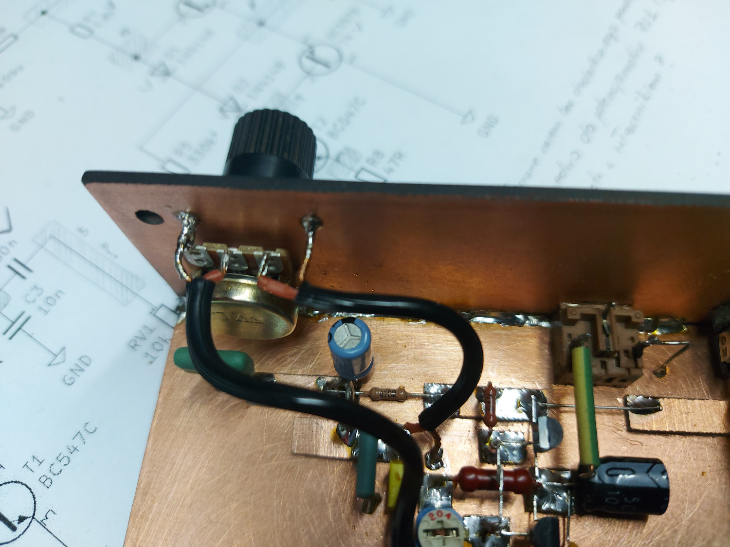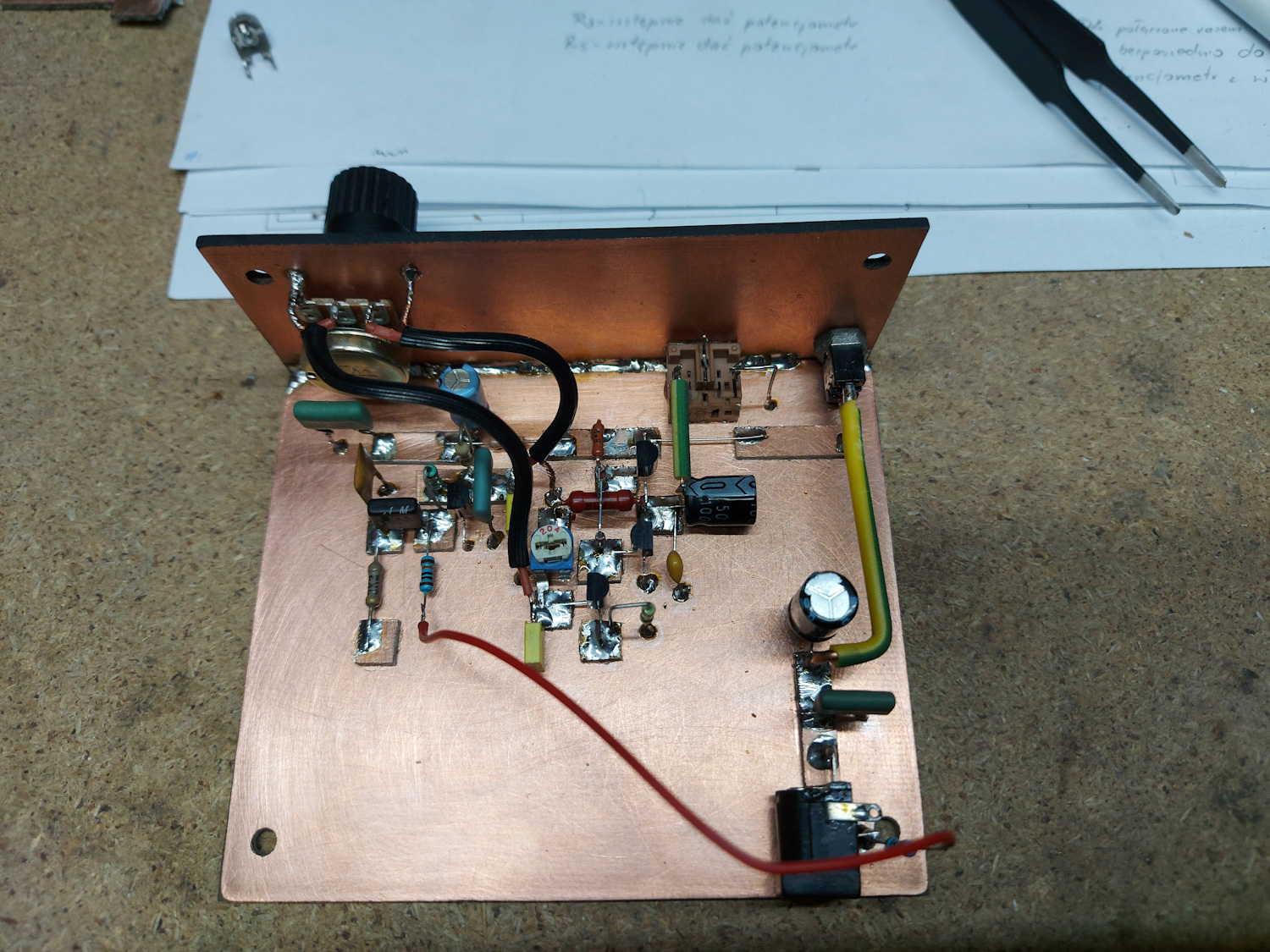 Na zdjęciach tym razem widać jeszcze "na pająku" rezystor R3, a właściwie dobieranie jego wartości do ustalenia napięcia na kolektorze T1 tylko właśnie jakie powinno być przy 9V zasilania.