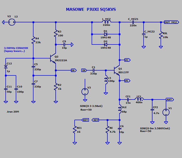 Przy nadawaniu, tak jak w PIXIE, zwieramy emiter do masy przez dławik DLE, z tym że tu obwodem wyjściowym jest filtr L (CF1, LF1, CF2) który ma dopasować impedancję emitera do anteny.