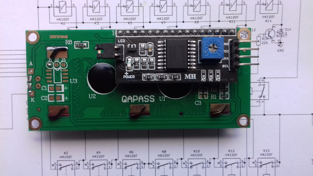 Stąd pomysł aby zastosować wyświetlacz 2x16 sterowany za pomocą I2C. Do połączenia z układem wyświetlacz potrzebuje tylko 4 linii a funkcjonalność jest niemal identyczna ze sterowaniem klasycznym. Trochę się naszukałem odpowiedniej biblioteki ale w końcu znalazłem taką z możliwością doboru adresu I2C.