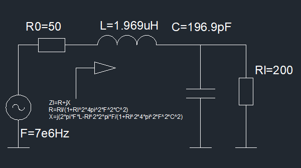 Tak więc układ LC ma dopasować do R0=50 omów obciążenie 200 omów na częstotliwości 7MHz. Oczywiście elementy LC muszą być w rezonansie na częstotliwości F=7MHz ale tą zależność spełnia nieskończona ilość par LC a jedynie jedna z nich zapewni dopasowanie (dla przypomnienia Frez=1/2/pi()/sqrt(L*C))